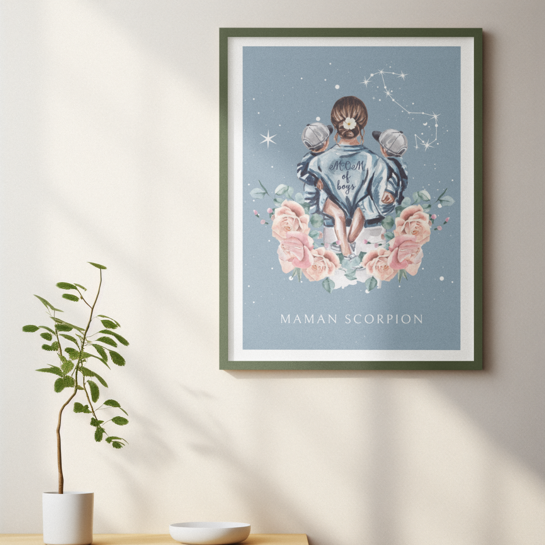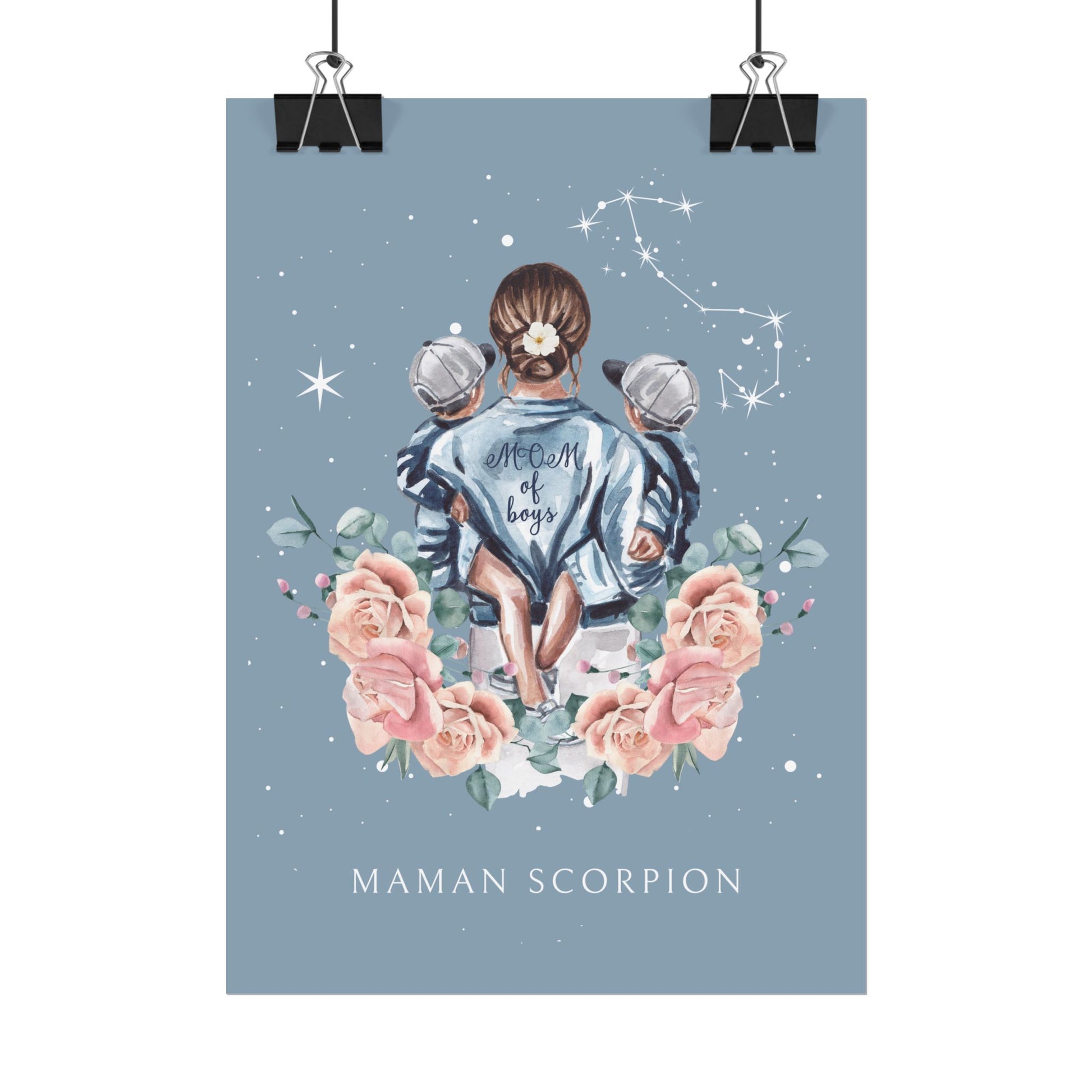 Apportez une touche de mystère et d’intensité à votre intérieur avec ce poster de la collection Cosmic Mum. L’illustration dépeint une mère tenant ses fils avec tendresse, sur un fond étoilé mettant en lumière la constellation du Scorpion. Ce design rend hommage au lien profond et transformateur entre une mère et son enfant.