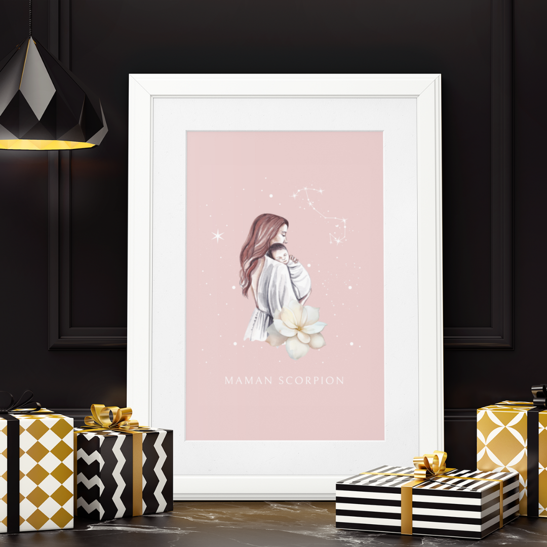 Apportez une touche de mystère et d’intensité à votre intérieur avec ce poster de la collection Cosmic Mum. L’illustration dépeint une mère tenant son bébé avec tendresse, sur un fond étoilé mettant en lumière la constellation du Scorpion. Ce design rend hommage au lien profond et transformateur entre une mère et son enfant.