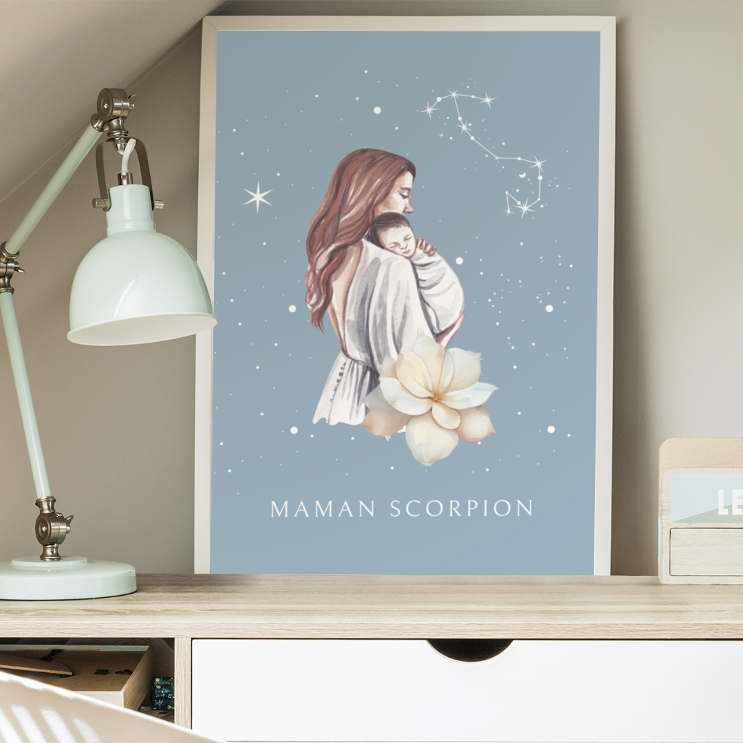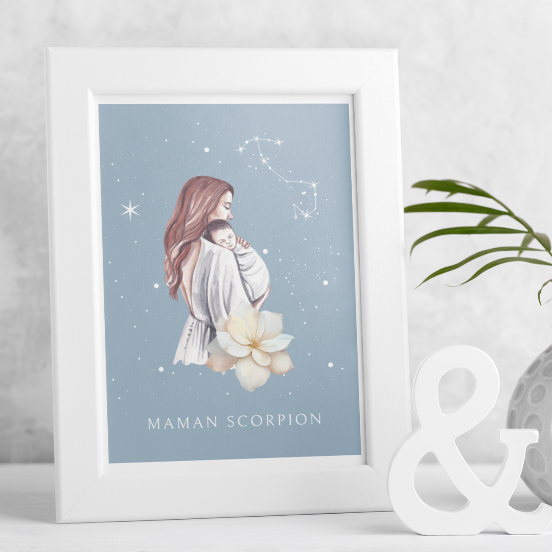 Apportez une touche de mystère et d’intensité à votre intérieur avec ce poster de la collection Cosmic Mum. L’illustration dépeint une mère tenant son bébé avec tendresse, sur un fond étoilé mettant en lumière la constellation du Scorpion. Ce design rend hommage au lien profond et transformateur entre une mère et son enfant.