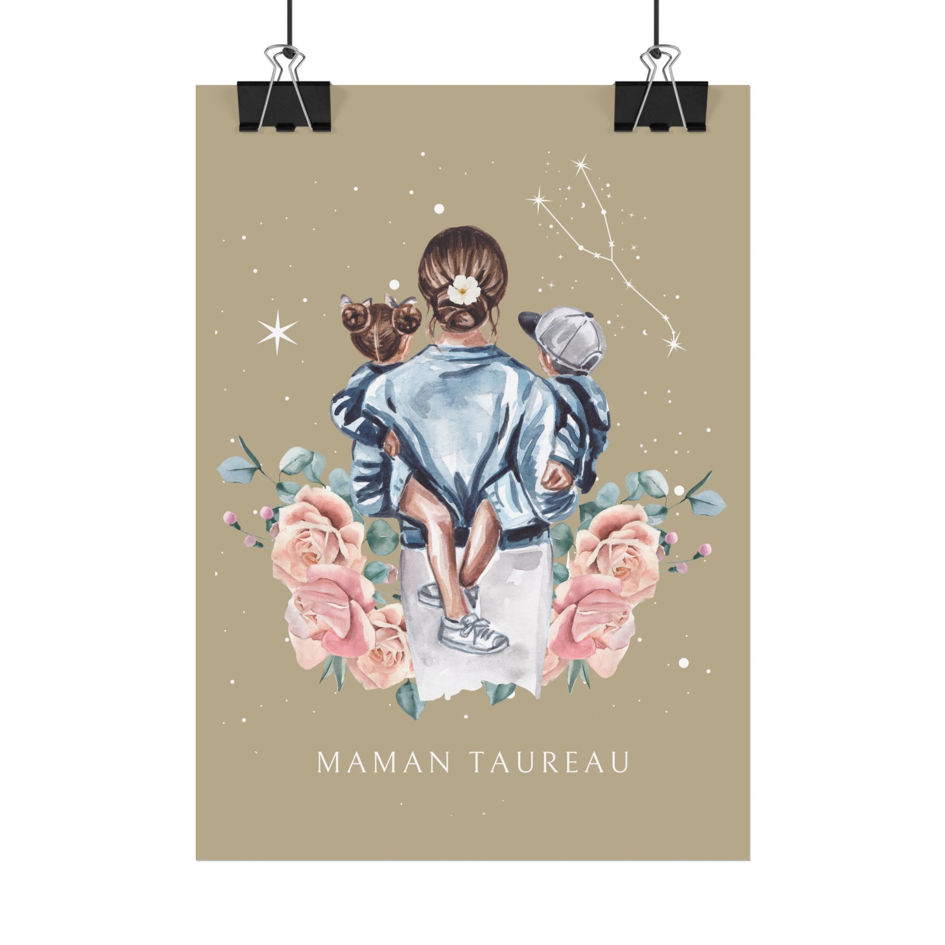 Ajoutez une touche de tendresse et de sérénité à votre intérieur avec ce poster de la collection Cosmic Mum. L’illustration représente une mère portant ses enfants dans les bras, sous un ciel étoilé orné de la constellation du Taureau. Une représentation émouvante de la maternité et de l’harmonie entre une mère et son enfant.