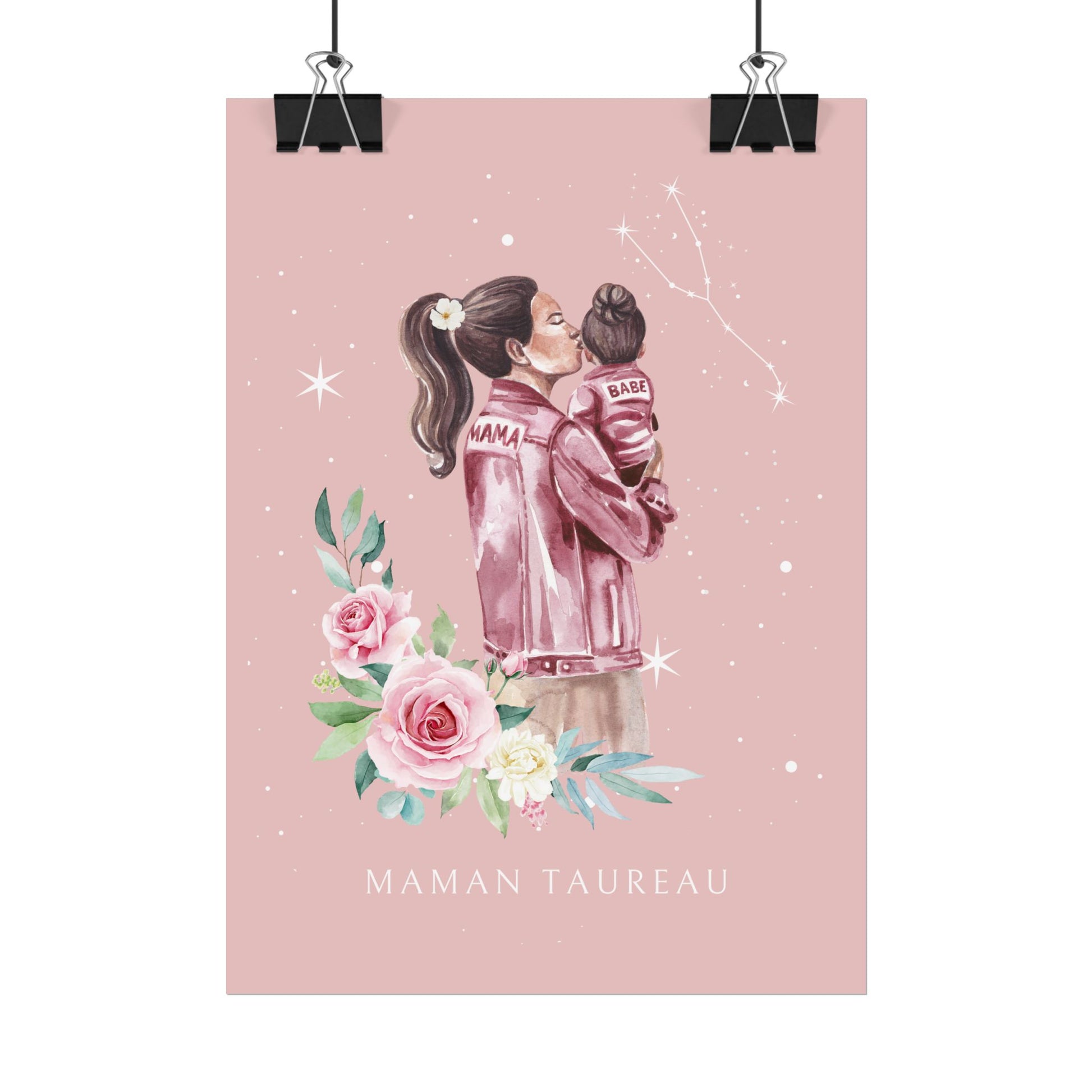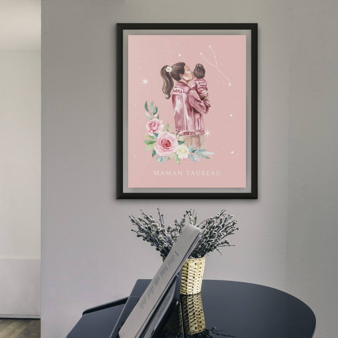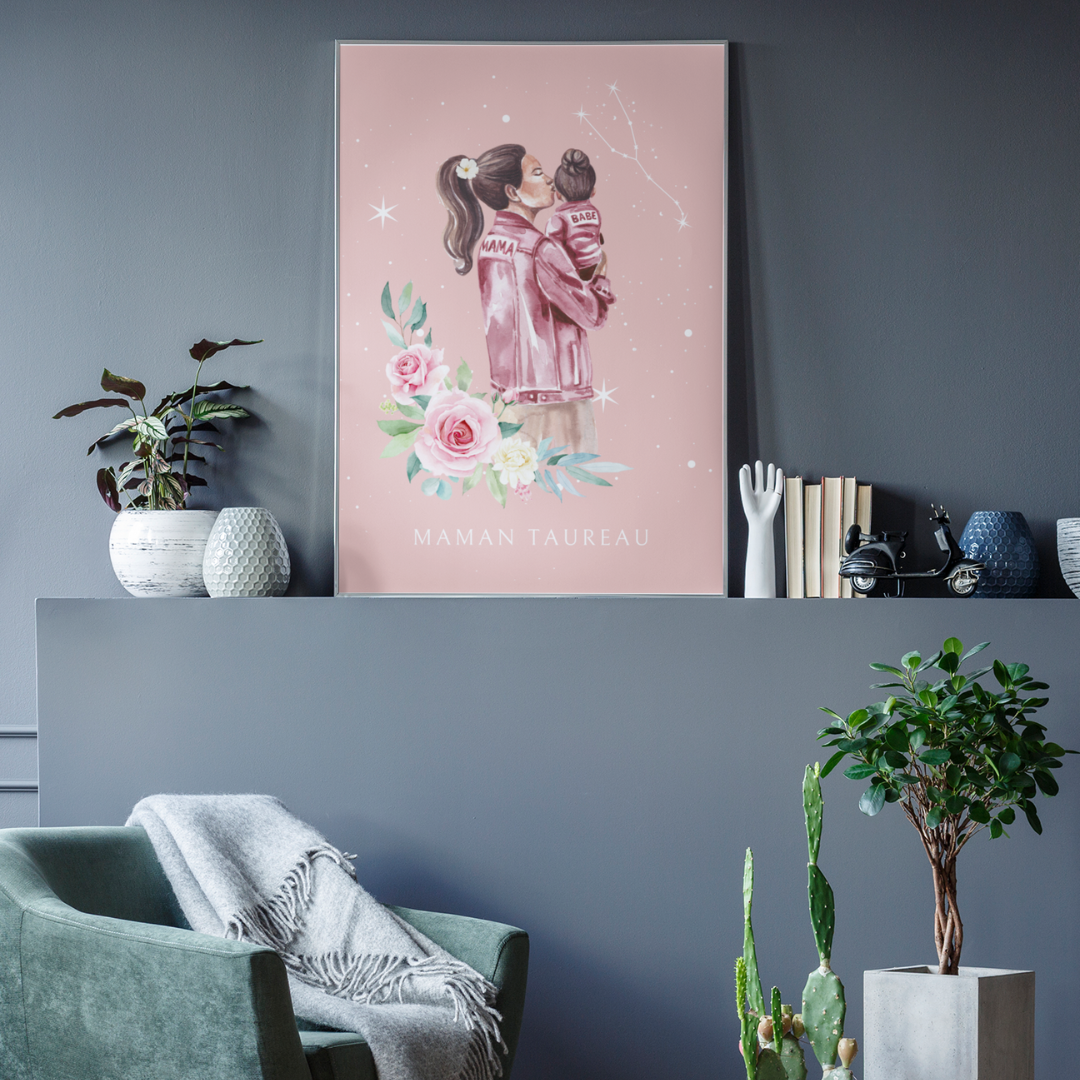 Ajoutez une touche de tendresse et de sérénité à votre intérieur avec ce poster de la collection Cosmic Mum. L’illustration représente une mère portant sa fille dans les bras, sous un ciel étoilé orné de la constellation du Taureau. Une représentation émouvante de la maternité et de l’harmonie entre une mère et son enfant.