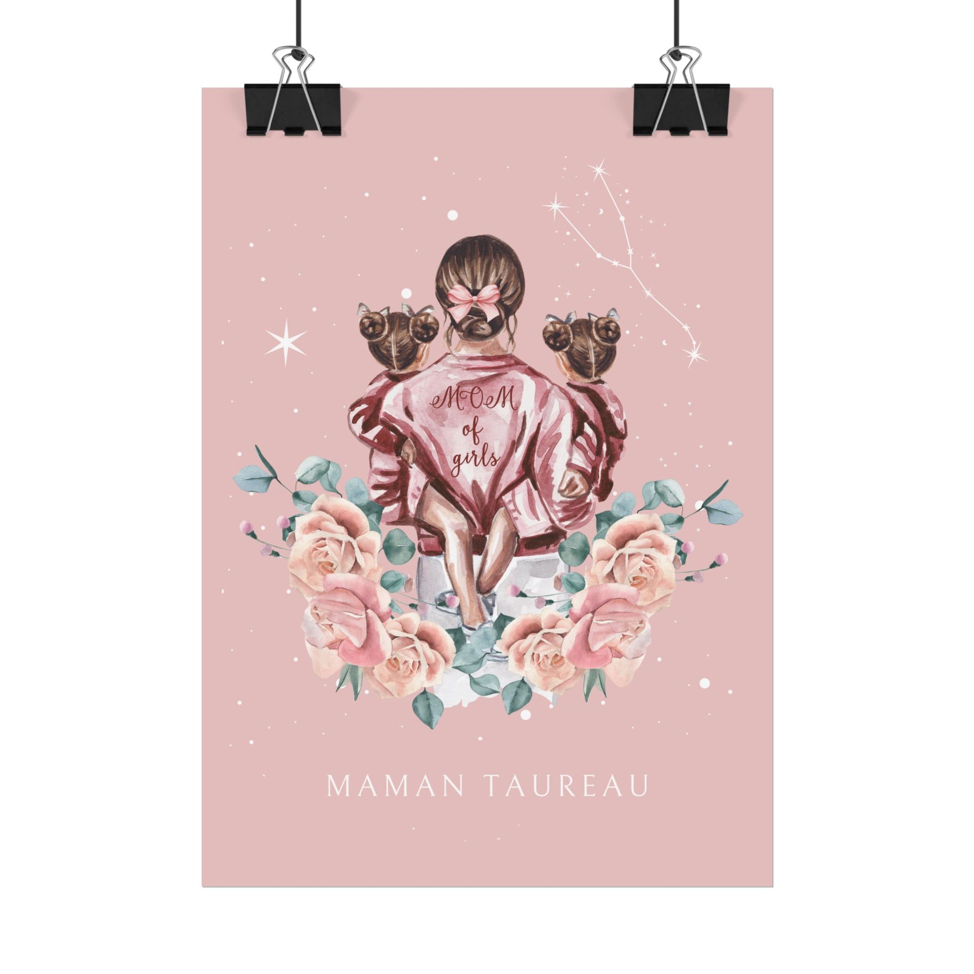 Ajoutez une touche de tendresse et de sérénité à votre intérieur avec ce poster de la collection Cosmic Mum. L’illustration représente une mère portant ses filles dans les bras, sous un ciel étoilé orné de la constellation du Taureau. Une représentation émouvante de la maternité et de l’harmonie entre une mère et son enfant.