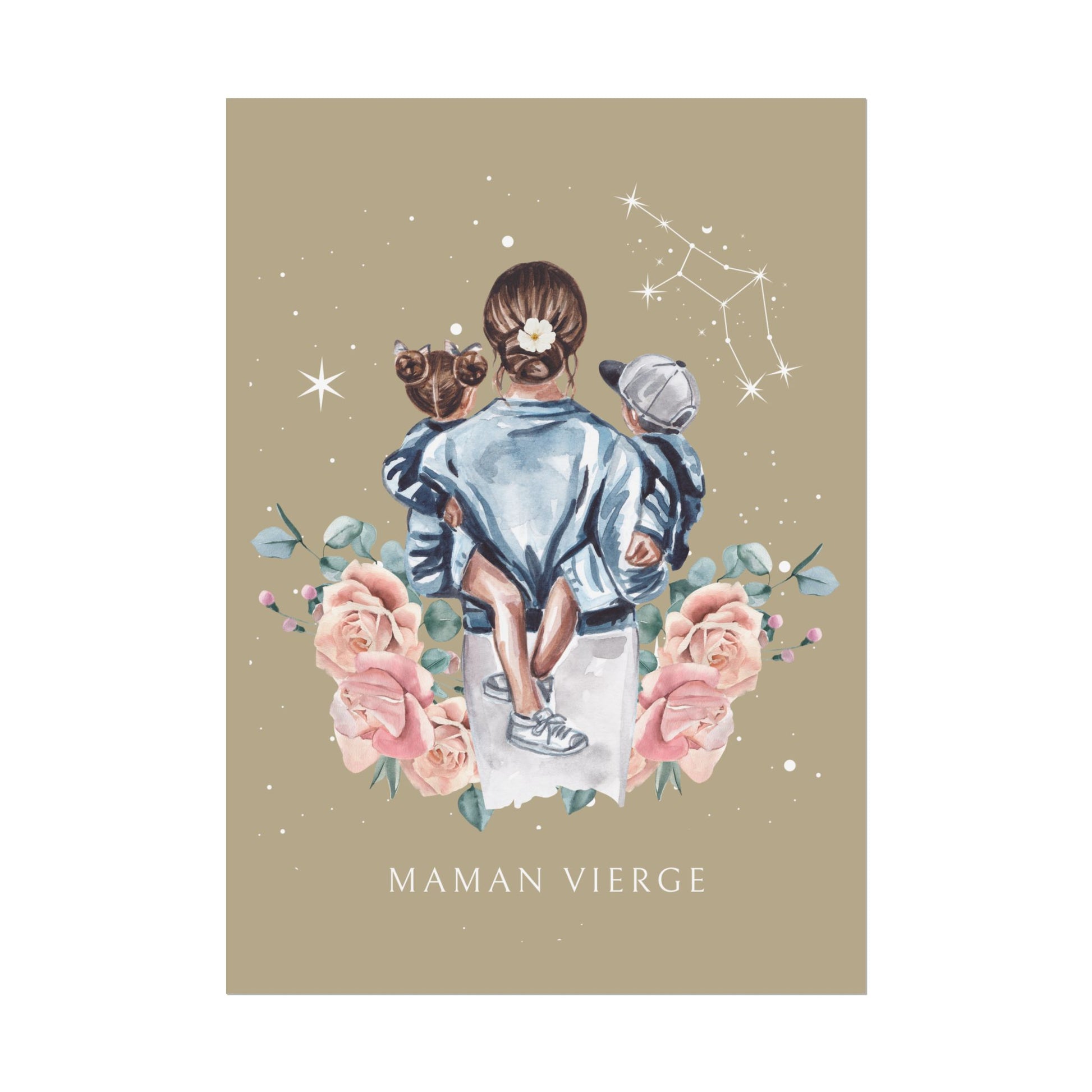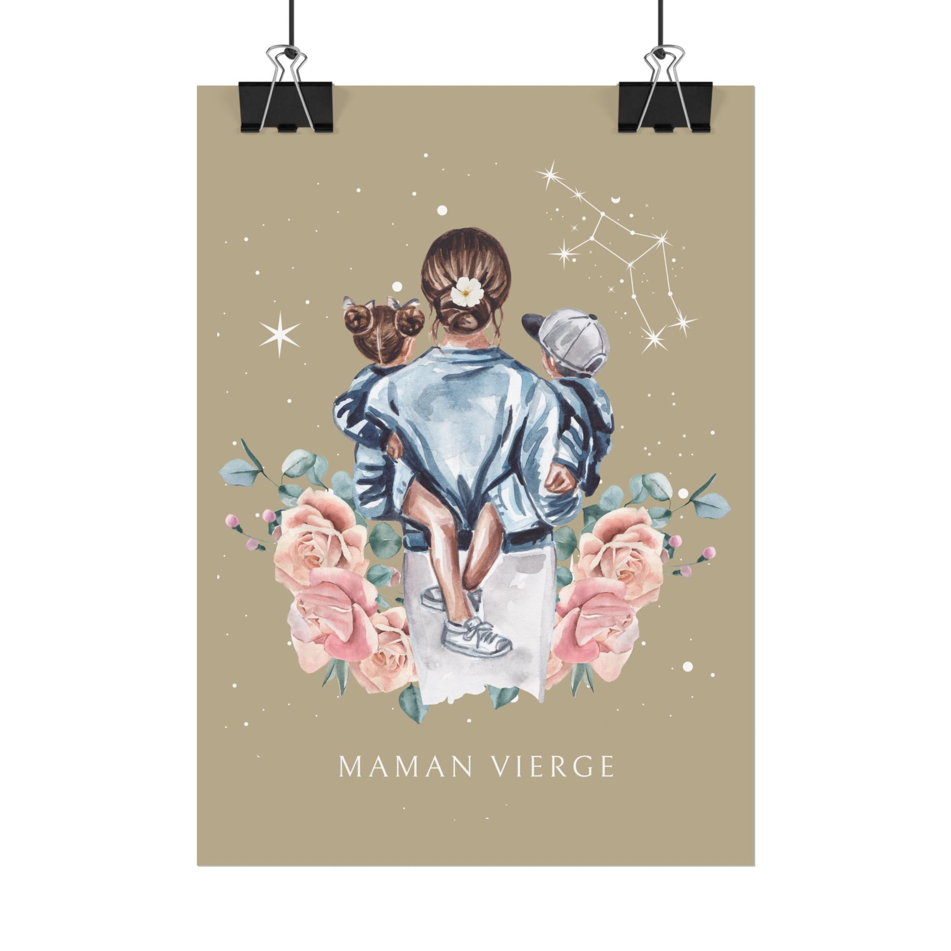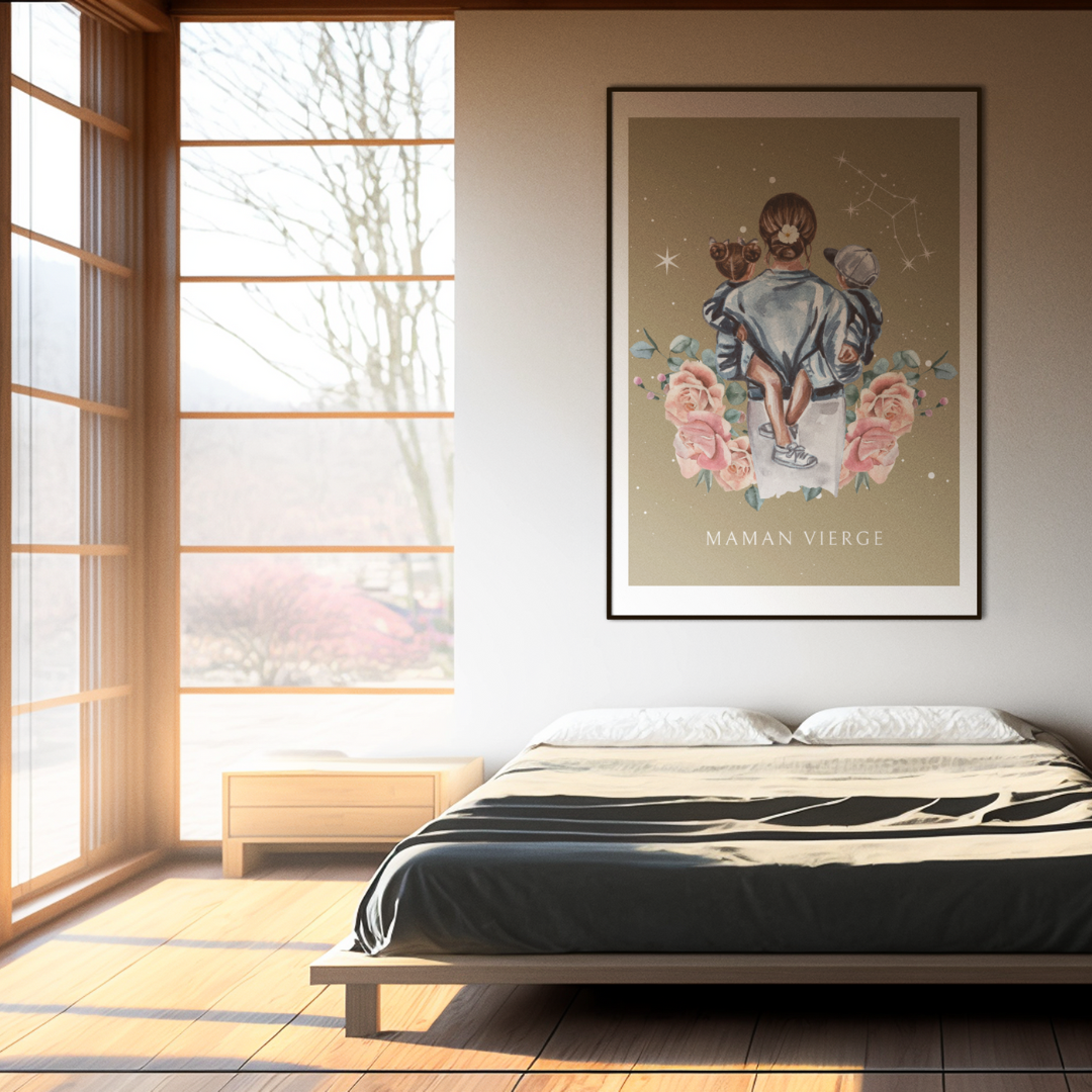 Apportez une note douce et raffinée à votre décoration avec ce poster de la collection Cosmic Mum. L’illustration représente une mère portant ses enfants avec grâce, sous un ciel étoilé orné de la constellation de la Vierge. Ce design célèbre la beauté et la précision du lien maternel.