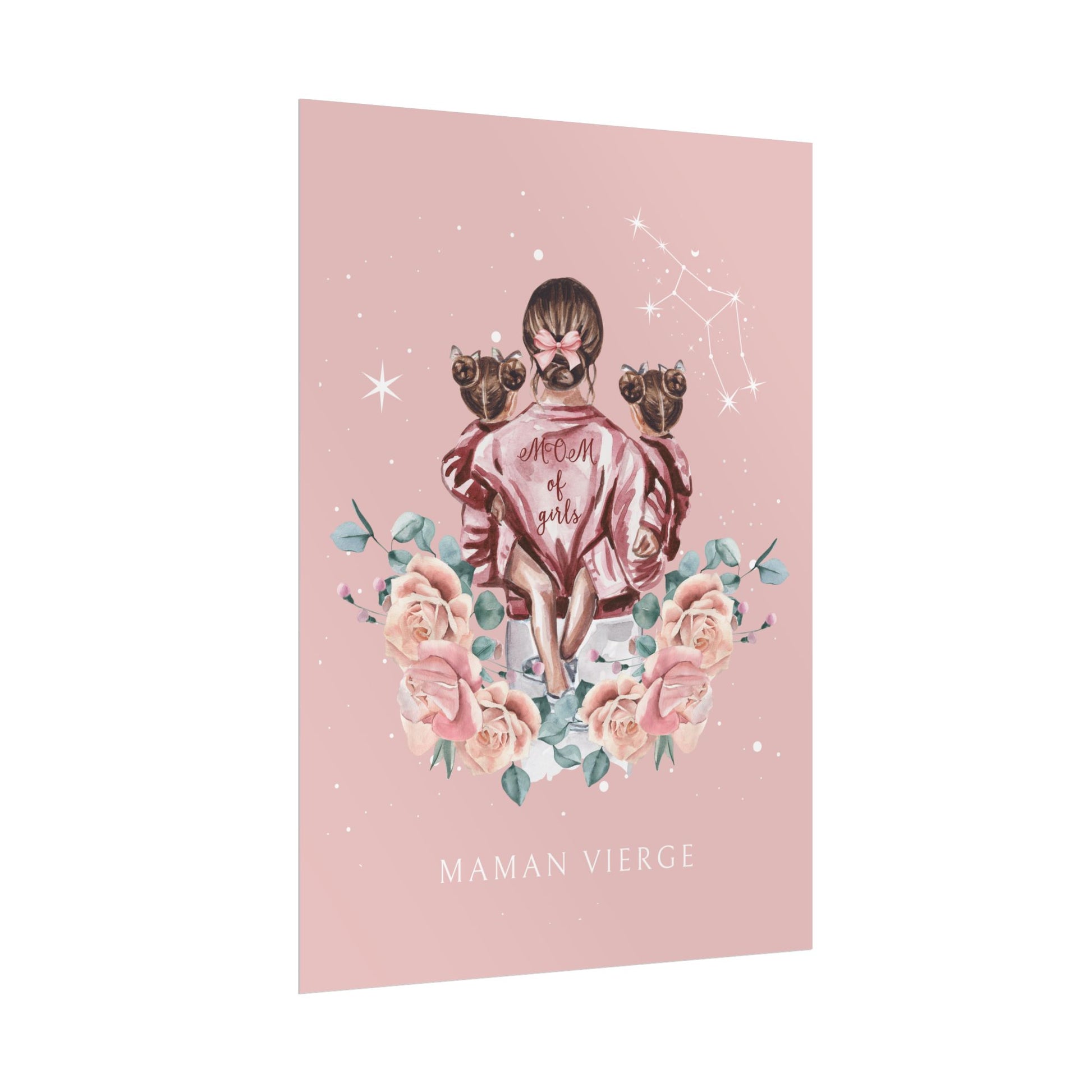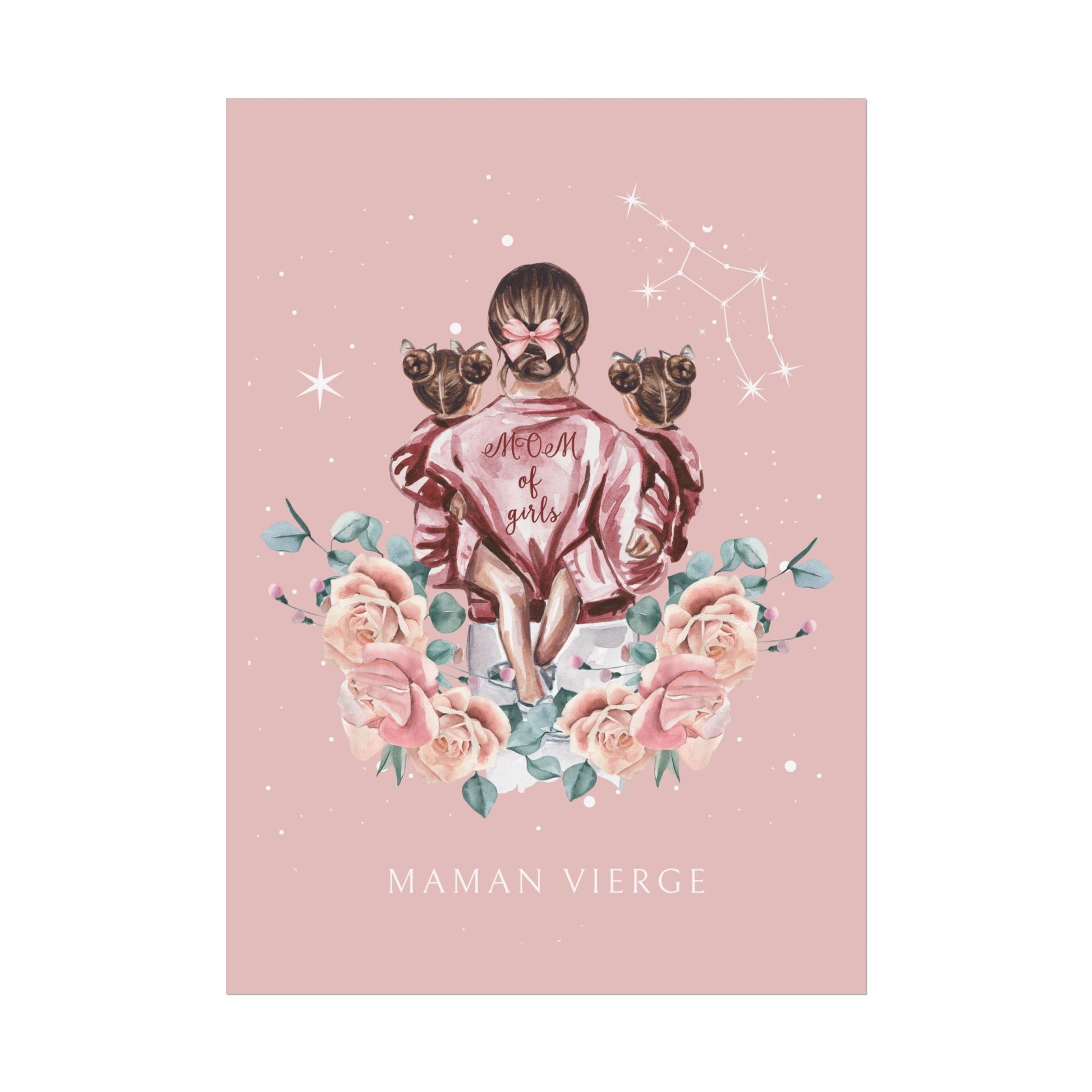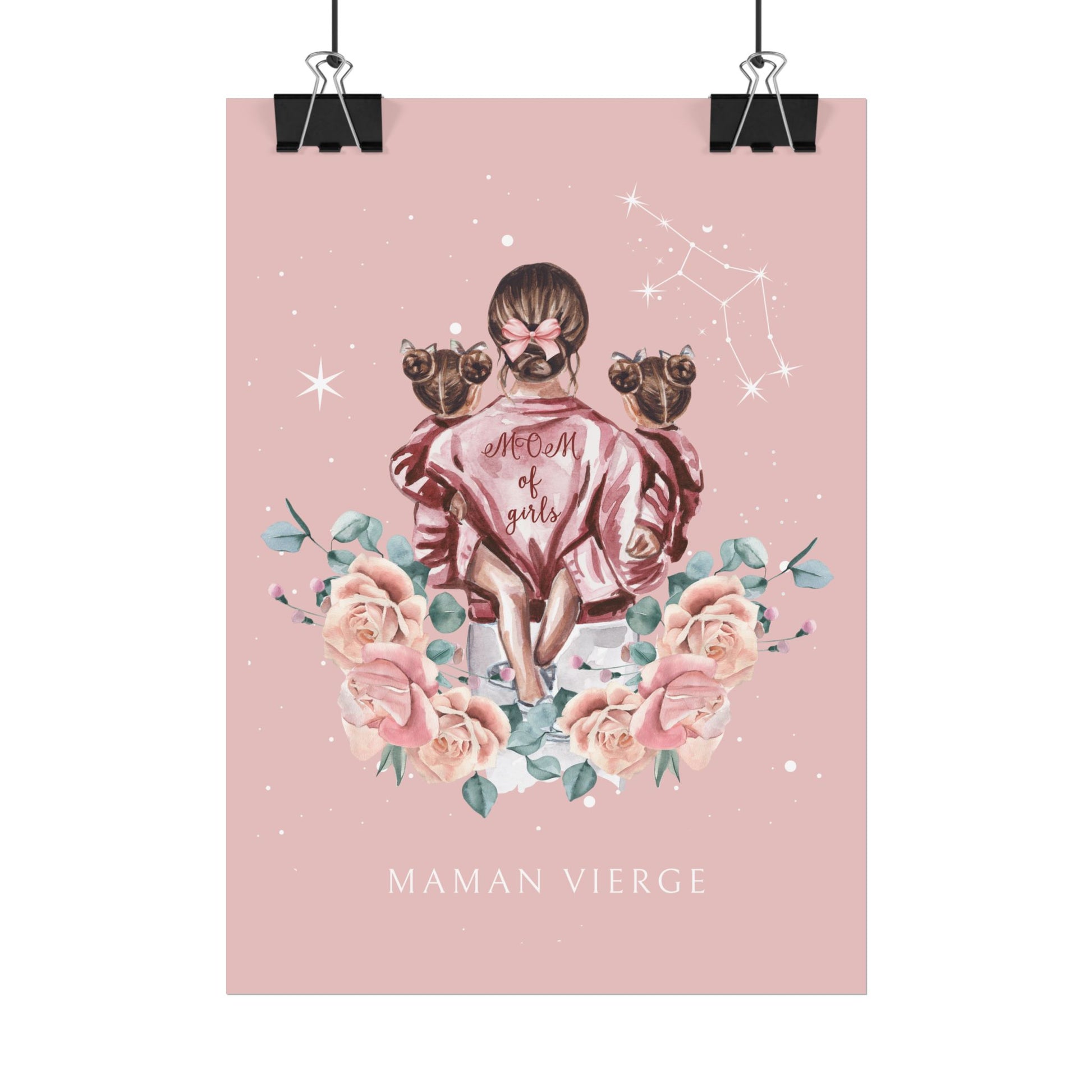 Apportez une note douce et raffinée à votre décoration avec ce poster de la collection Cosmic Mum. L’illustration représente une mère portant ses filles avec grâce, sous un ciel étoilé orné de la constellation de la Vierge. Ce design célèbre la beauté et la précision du lien maternel.