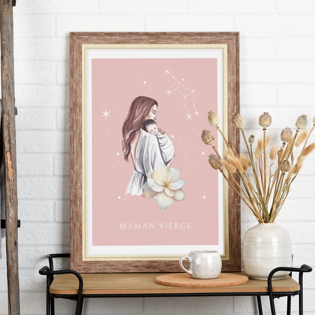 Apportez une note douce et raffinée à votre décoration avec ce poster de la collection Cosmic Mum. L’illustration représente une mère portant son bébé avec grâce, sous un ciel étoilé orné de la constellation de la Vierge. Ce design célèbre la beauté et la précision du lien maternel.