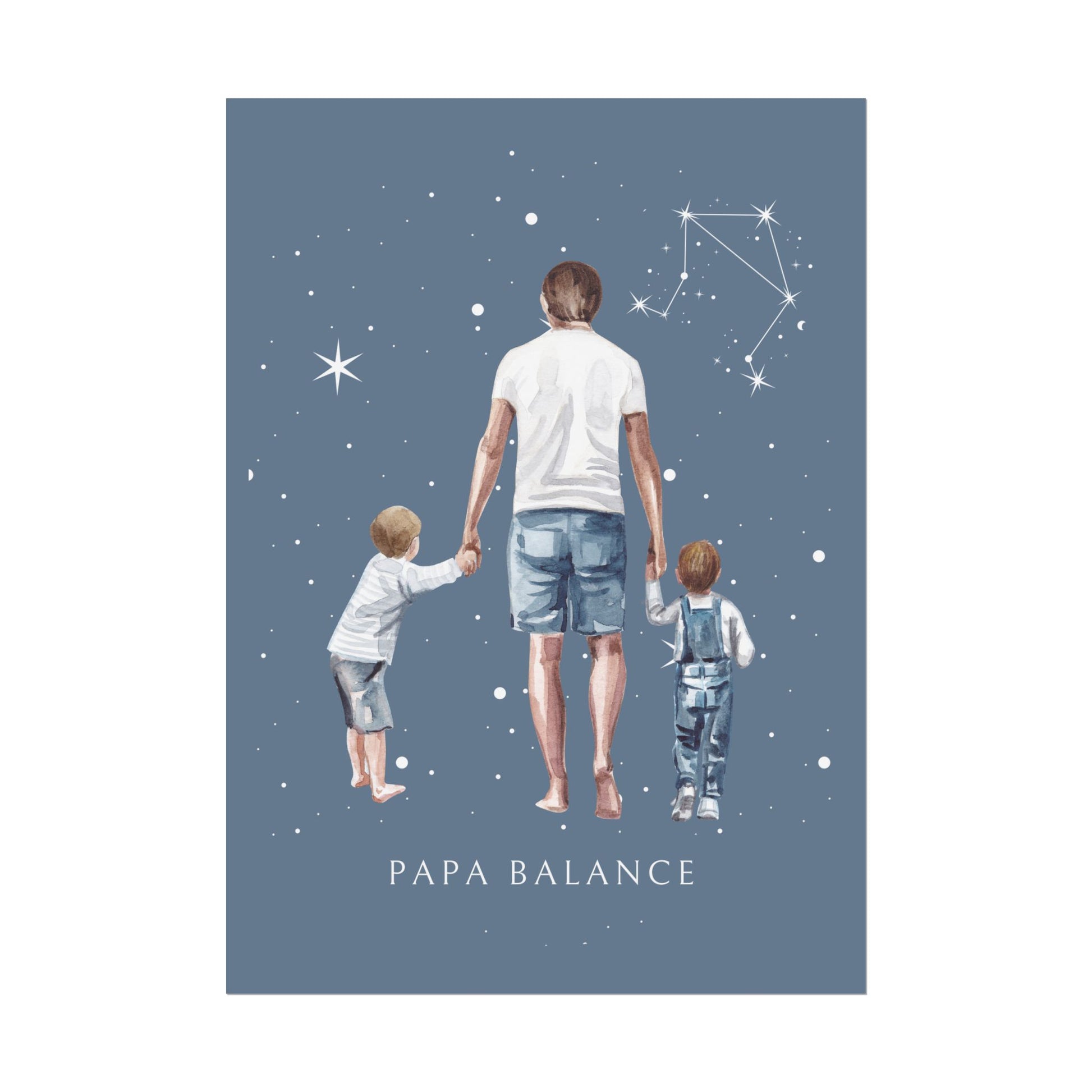 Apportez une touche d’harmonie et d’élégance à votre intérieur avec ce poster de la collection Cosmic Dad. L’illustration met en scène un père tenant tendrement ses fils par la main, sur un fond étoilé mettant en valeur la constellation de la Balance. Ce design célèbre le lien délicat et équilibré entre un père et son enfant.