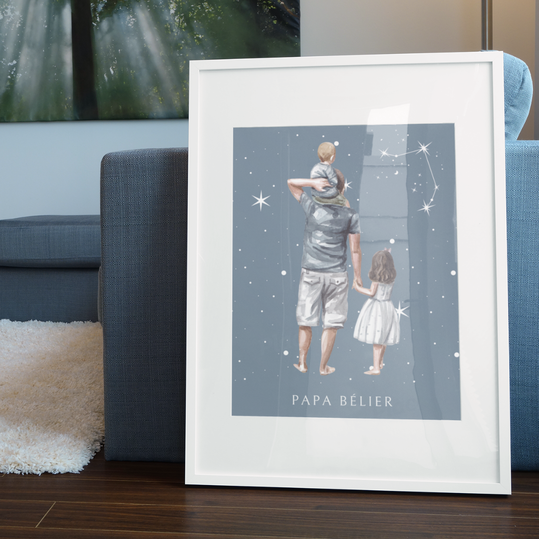 Ajoutez une touche d’amour et de sérénité à votre intérieur avec ce poster de la collection Cosmic Dad. L’illustration représente un père et ses enfants, sous un fond étoilé mettant en avant la constellation du Bélier. Une ode à la paternité et à la connexion universelle entre un père et son enfant.