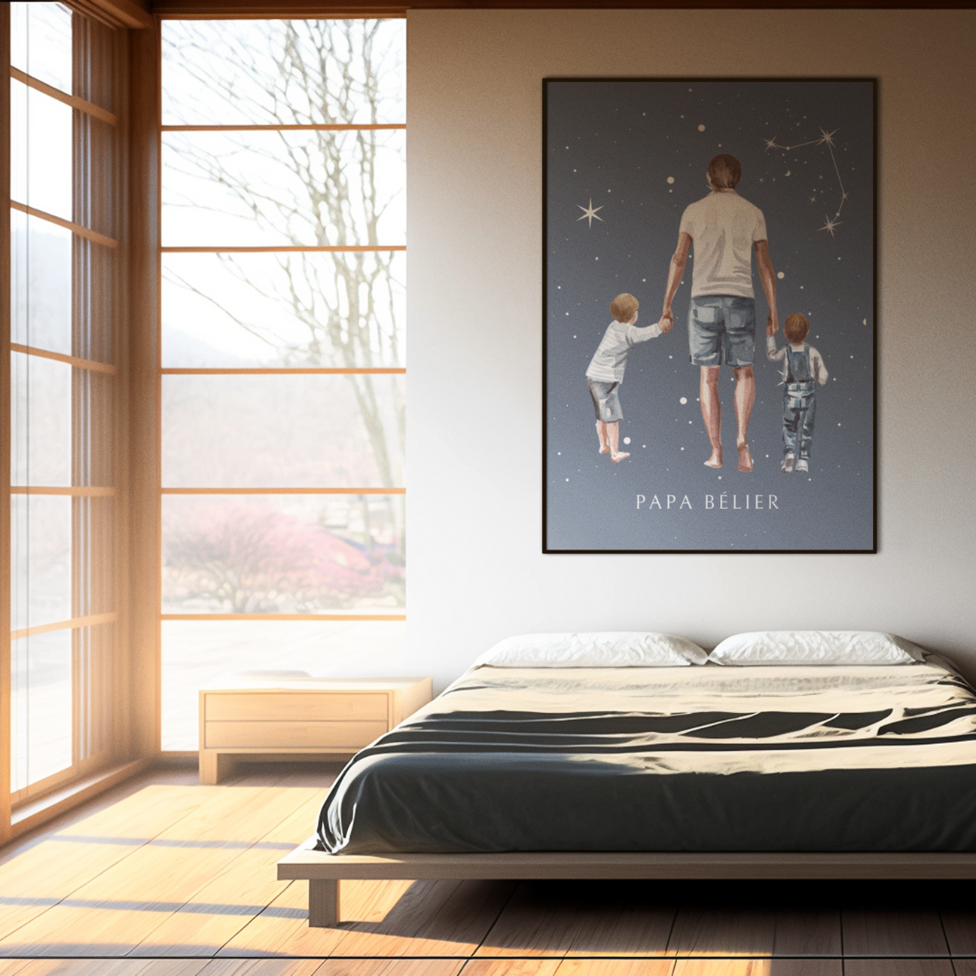 Ajoutez une touche d’amour et de sérénité à votre intérieur avec ce poster de la collection Cosmic Dad. L’illustration représente un père tenant tendrement ses fils par les mains, sous un fond étoilé mettant en avant la constellation du Bélier. Une ode à la paternité et à la connexion universelle entre un père et son enfant.
