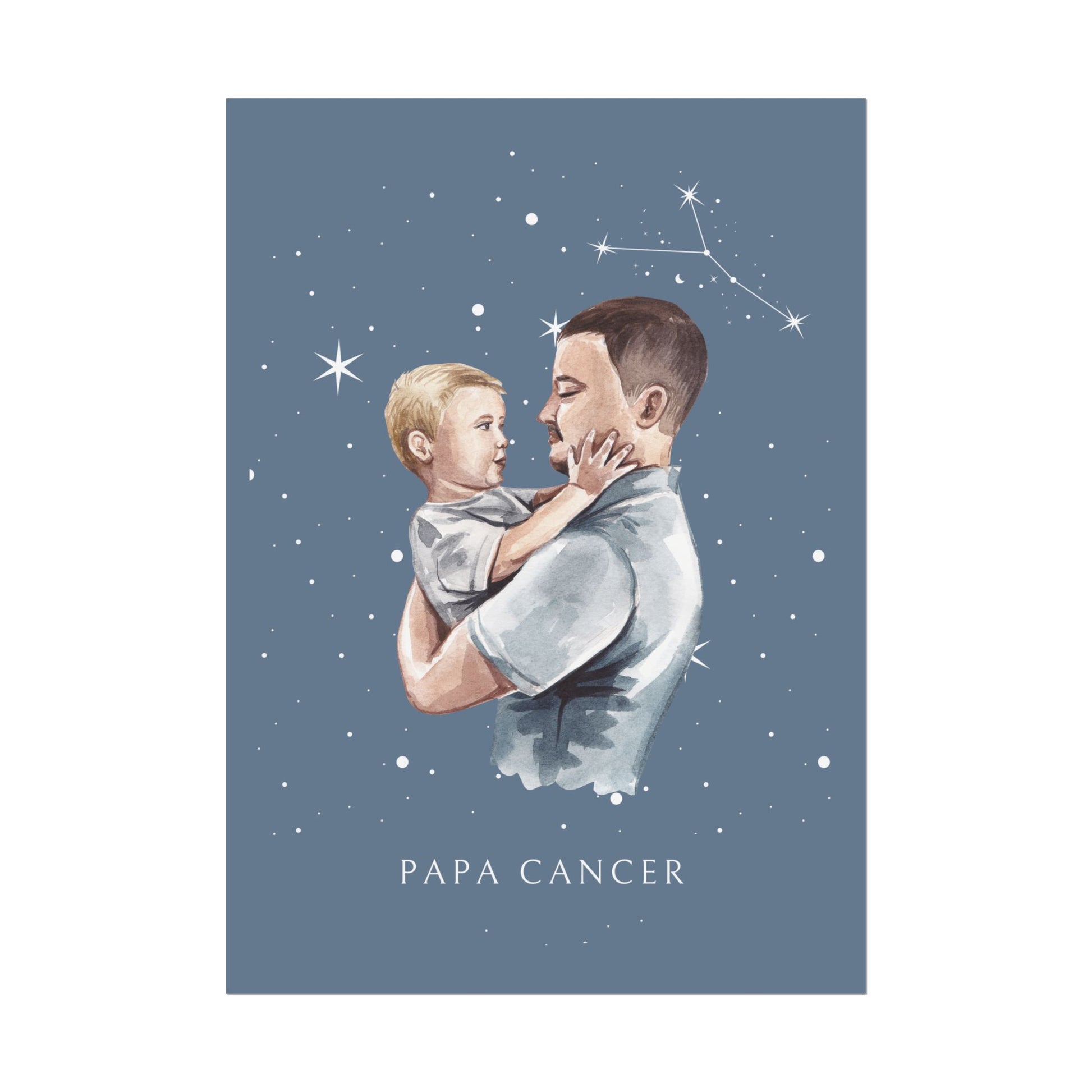 Ajoutez une touche d’émotion et de poésie à votre décoration avec ce poster de la collection Cosmic Dad. L’illustration met en scène un père portant tendrement son fils, enveloppés sous un ciel étoilé où brille la constellation du Cancer. Cette œuvre célèbre la douceur et la profondeur du lien paternel.