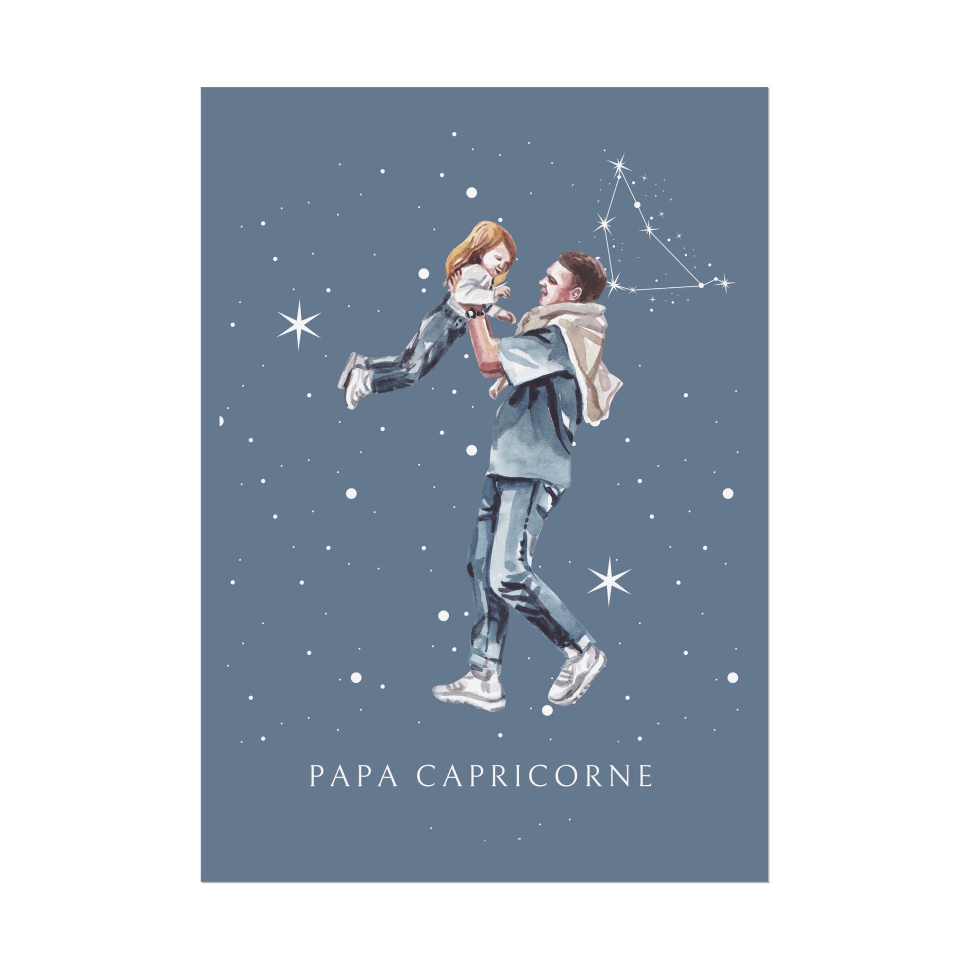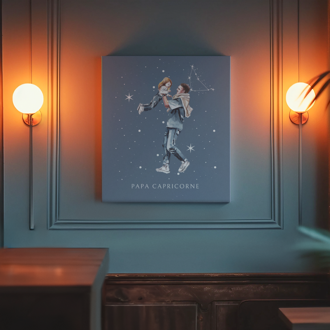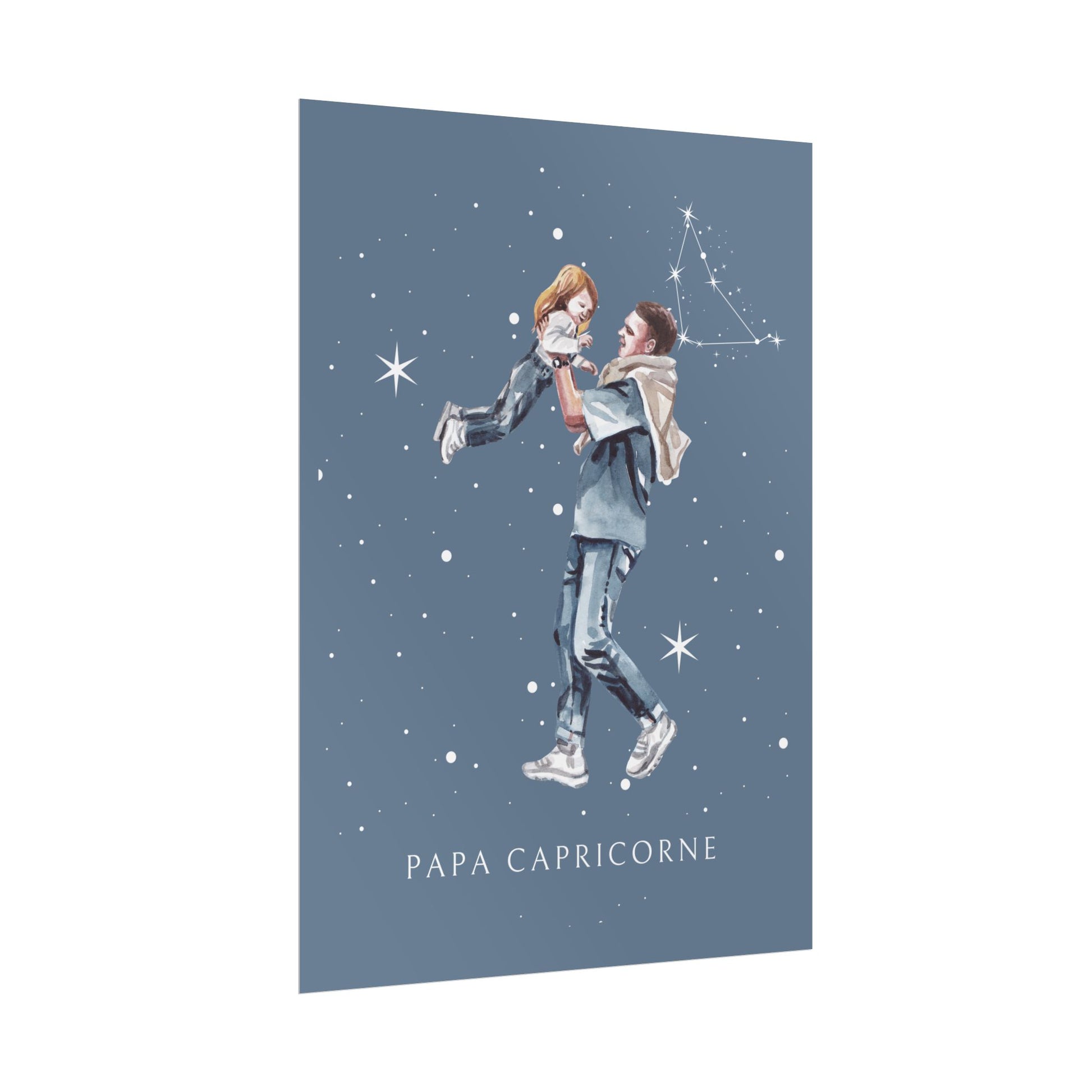 Apportez une élégance intemporelle et une énergie de réflexion à votre intérieur avec ce poster de la collection Cosmic Dad. L’illustration représente un père portant tendrement sa fille, sur un fond étoilé mettant en valeur la constellation du Capricorne. Ce design capture la force et la sagesse d'un père Capricorne.