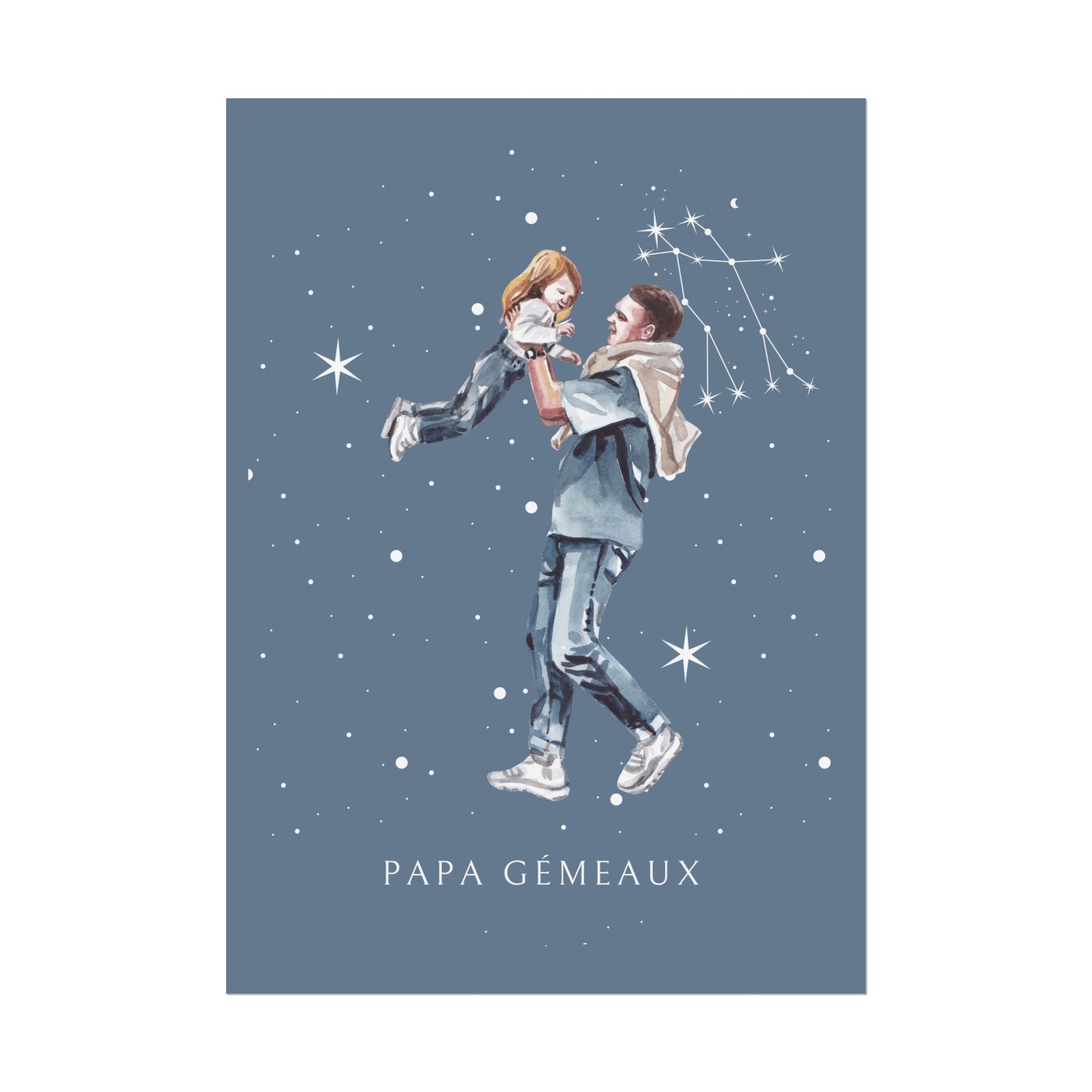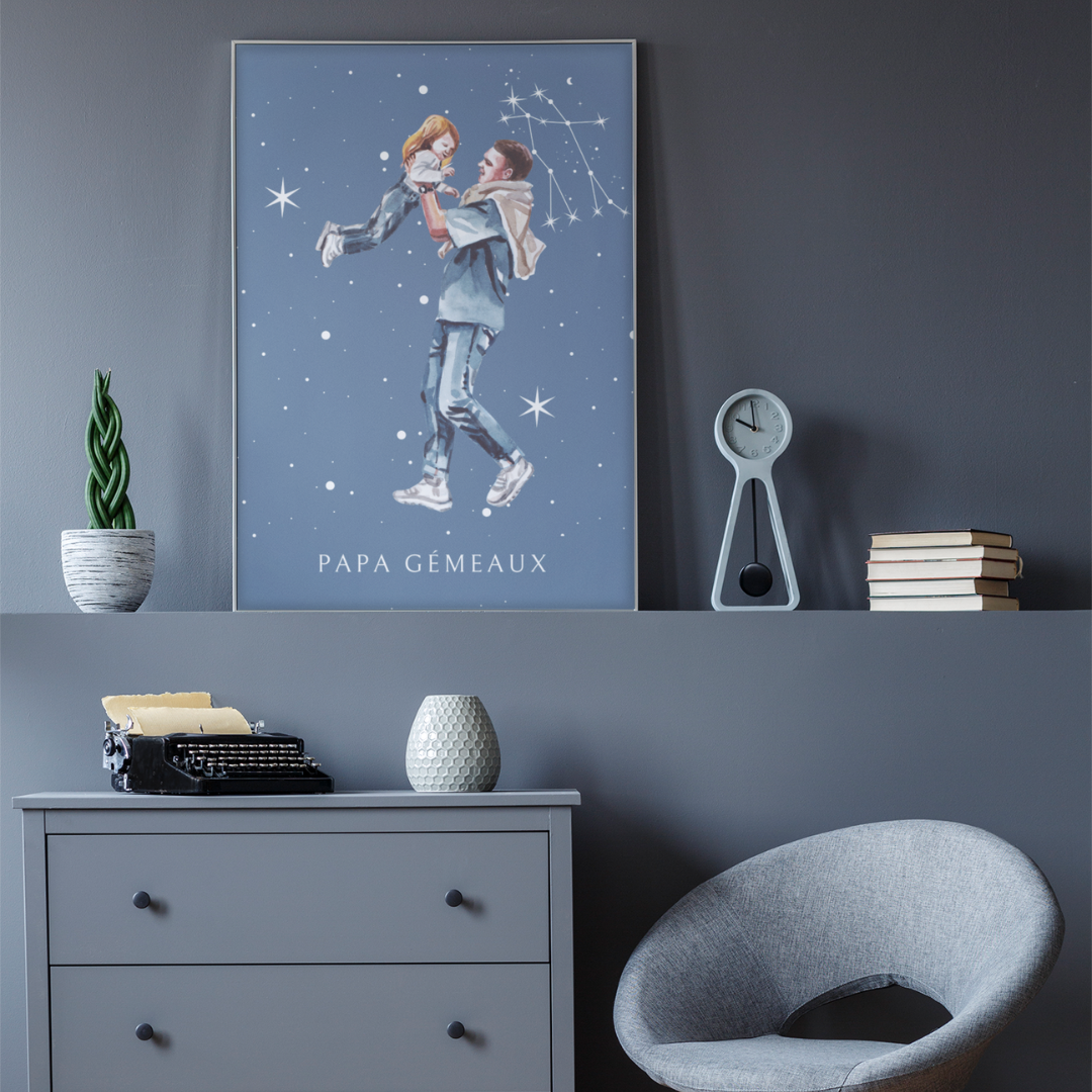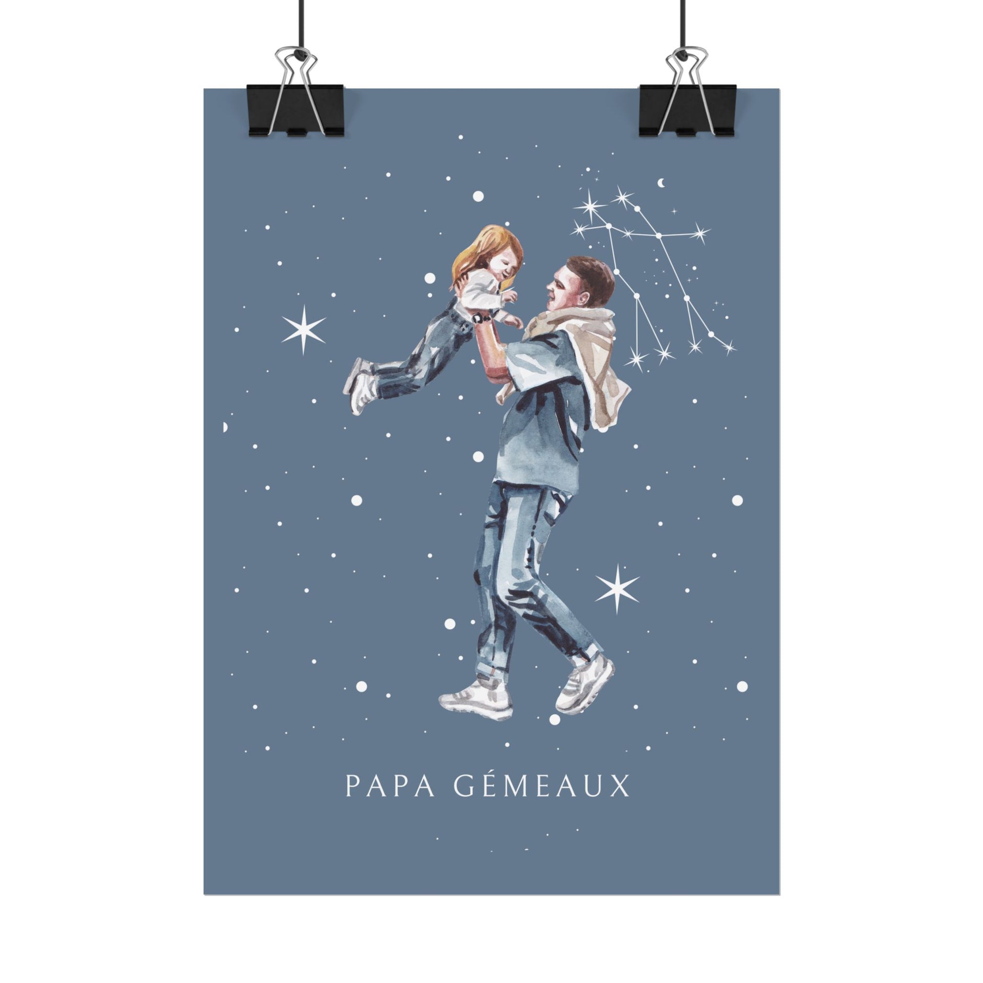 Ajoutez une touche d’élégance et de tendresse à votre décoration avec ce poster de la collection Cosmic Dad. L’illustration représente un père tenant sa fille dans les bras, bercés sous un ciel étoilé décoré de la constellation des Gémeaux. Cette œuvre capture l’essence de la paternité dans toute sa splendeur.