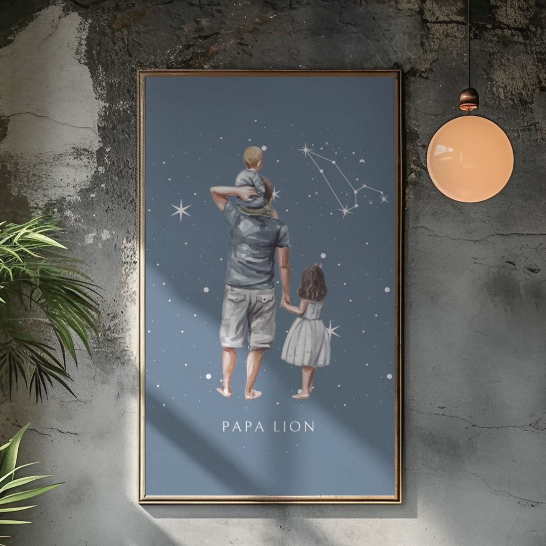 Ajoutez une touche de force et de chaleur à votre décoration avec ce poster de la collection Cosmic Dad. L’illustration met en scène un père avec ses enfants sous un ciel étoilé illuminé par la constellation du Lion. Ce design rend hommage à la puissance et à la noblesse du lien paternel.