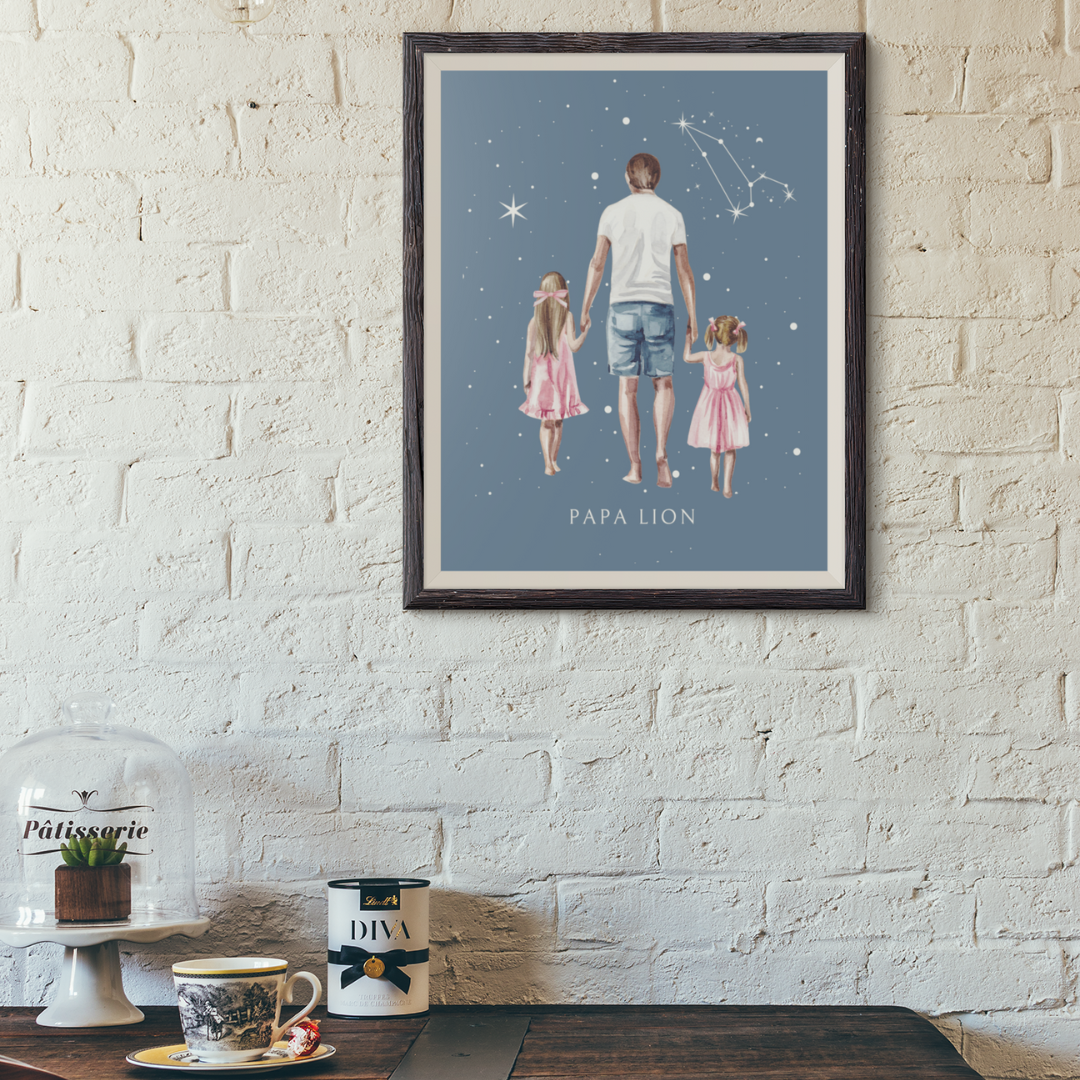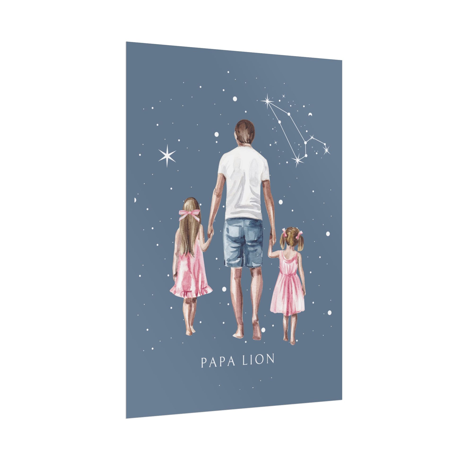 Ajoutez une touche de force et de chaleur à votre décoration avec ce poster de la collection Cosmic Dad. L’illustration met en scène un père tenant tendrement ses filles par la main, sous un ciel étoilé illuminé par la constellation du Lion. Ce design rend hommage à la puissance et à la noblesse du lien paternel.