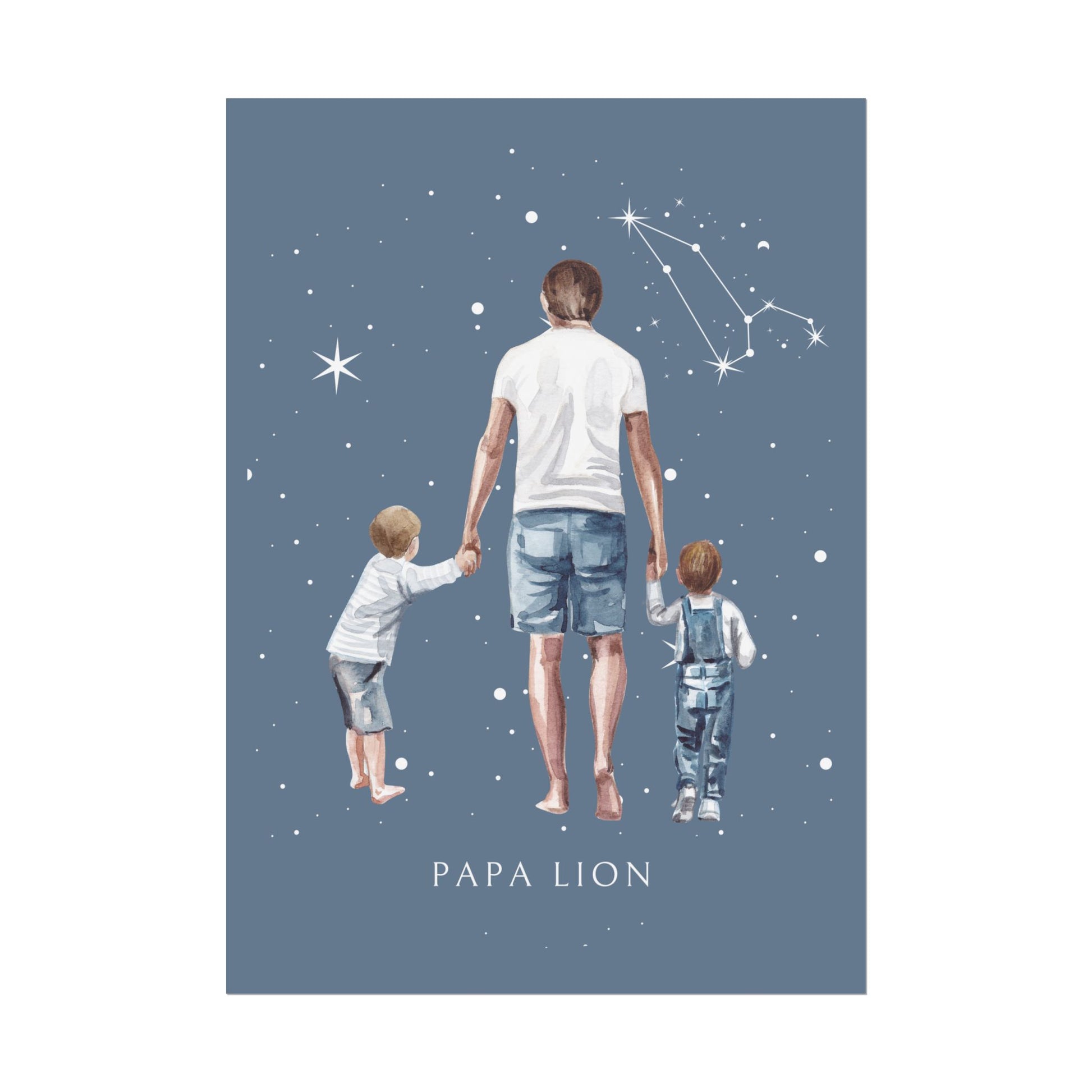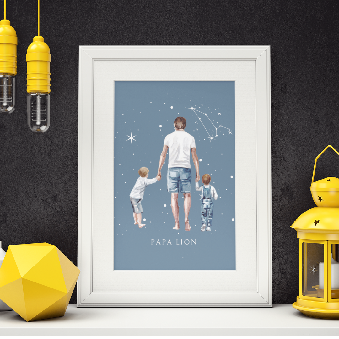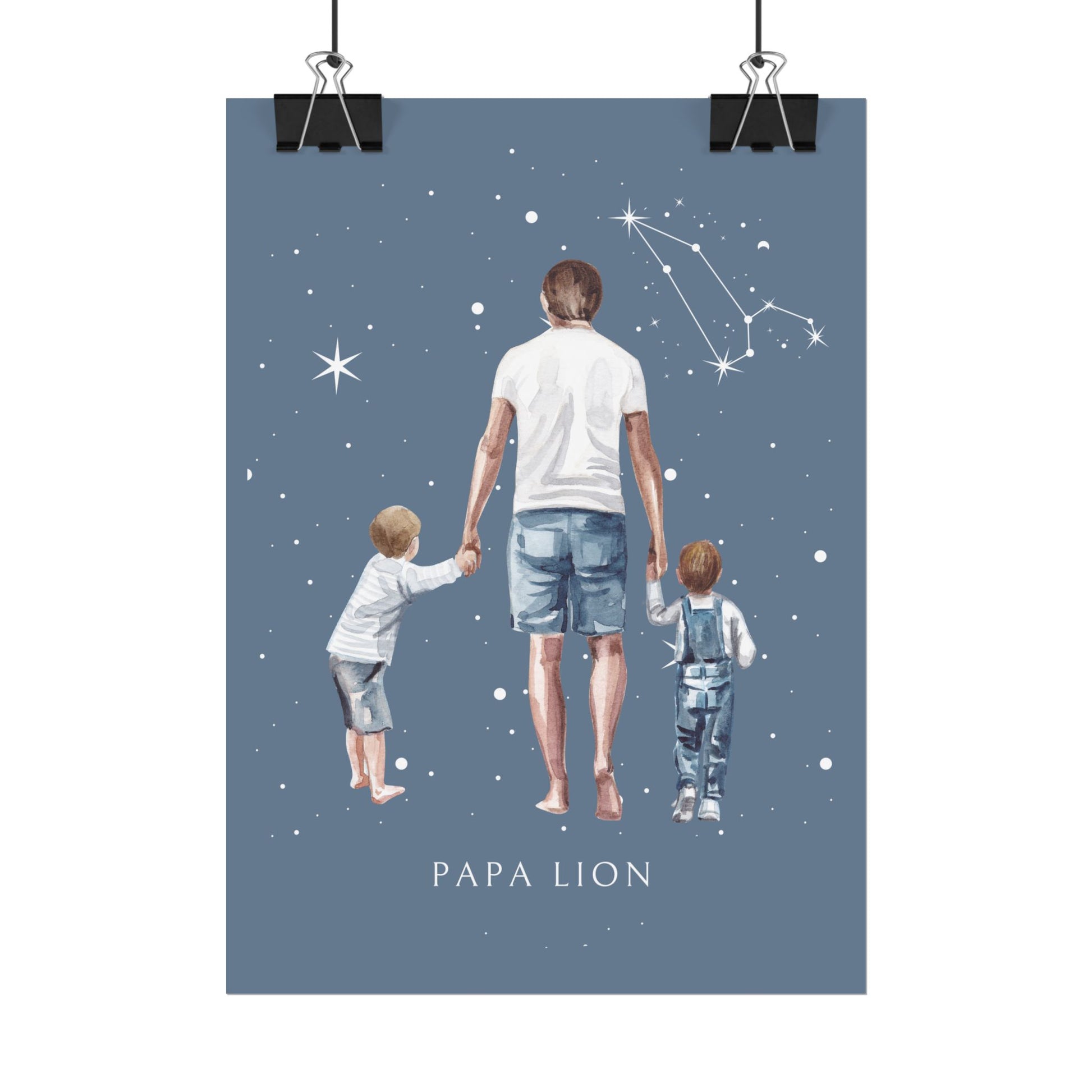Ajoutez une touche de force et de chaleur à votre décoration avec ce poster de la collection Cosmic Dad. L’illustration met en scène un père tenant tendrement ses fils par la main, sous un ciel étoilé illuminé par la constellation du Lion. Ce design rend hommage à la puissance et à la noblesse du lien paternel.