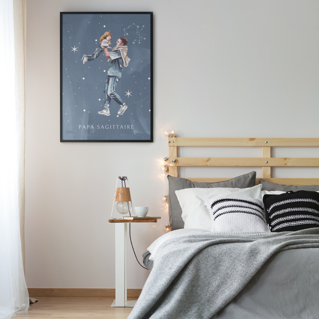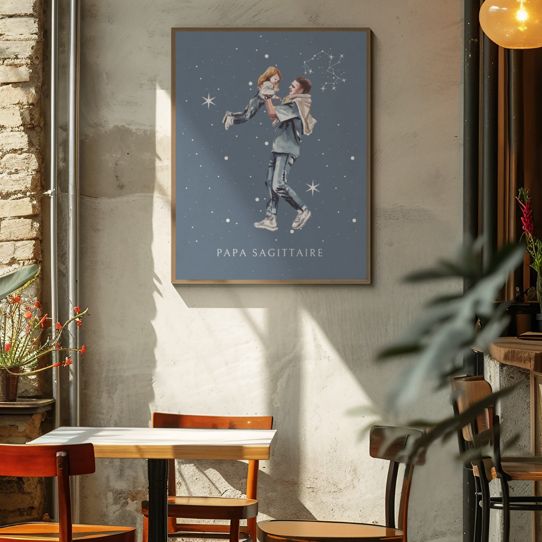 pportez une énergie positive et une touche d’aventure à votre intérieur avec ce poster de la collection Cosmic Dad. L’illustration représente un père portant tendrement sa fille, sur un fond étoilé mettant en valeur la constellation du Sagittaire. Ce design capture la connexion unique et joyeuse entre un père et son enfant.