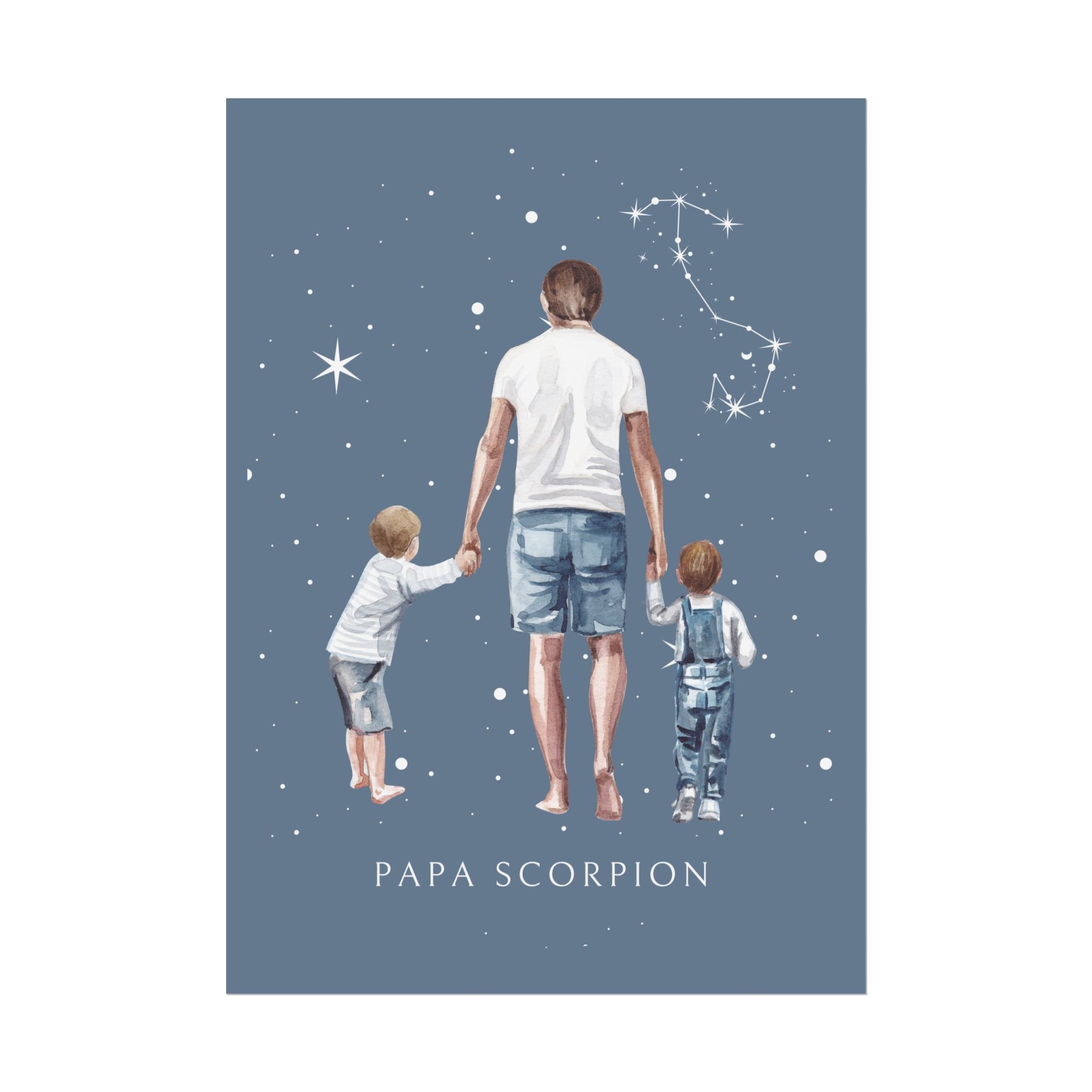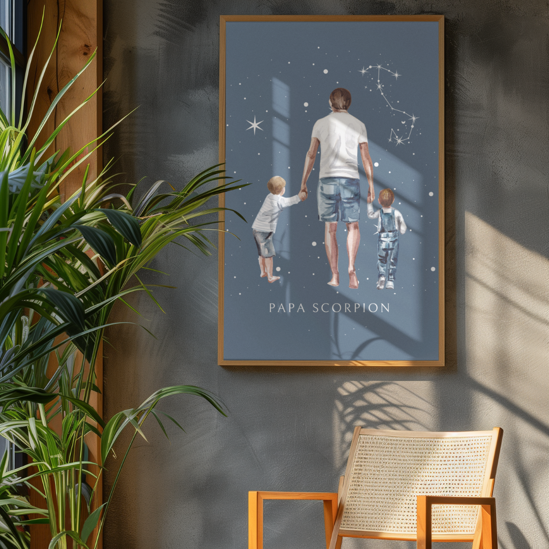 Apportez une touche de mystère et d’intensité à votre intérieur avec ce poster de la collection Cosmic Dad. L’illustration dépeint un père tenant tendrement ses fils par la main, sur un fond étoilé mettant en lumière la constellation du Scorpion. Ce design rend hommage au lien profond et transformateur entre un père et son enfant.
