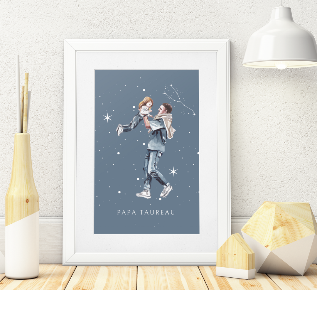 Ajoutez une touche de tendresse et de sérénité à votre intérieur avec ce poster de la collection Cosmic Dad. L’illustration représente un père portant sa fille dans les bras, sous un ciel étoilé orné de la constellation du Taureau. Une représentation émouvante de la paternité et de l’harmonie entre un père et son enfant.