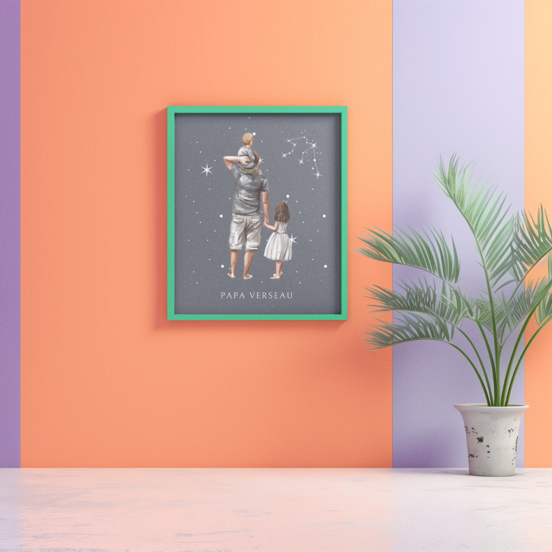 Apportez une touche d’originalité et de bienveillance à votre intérieur avec ce poster de la collection Cosmic Dad. L’illustration montre un père et ses enfants baignés dans la lumière douce de la constellation du Verseau. Ce design représente la paternité unique d'un papa Verseau, plein d’amour et de vision.