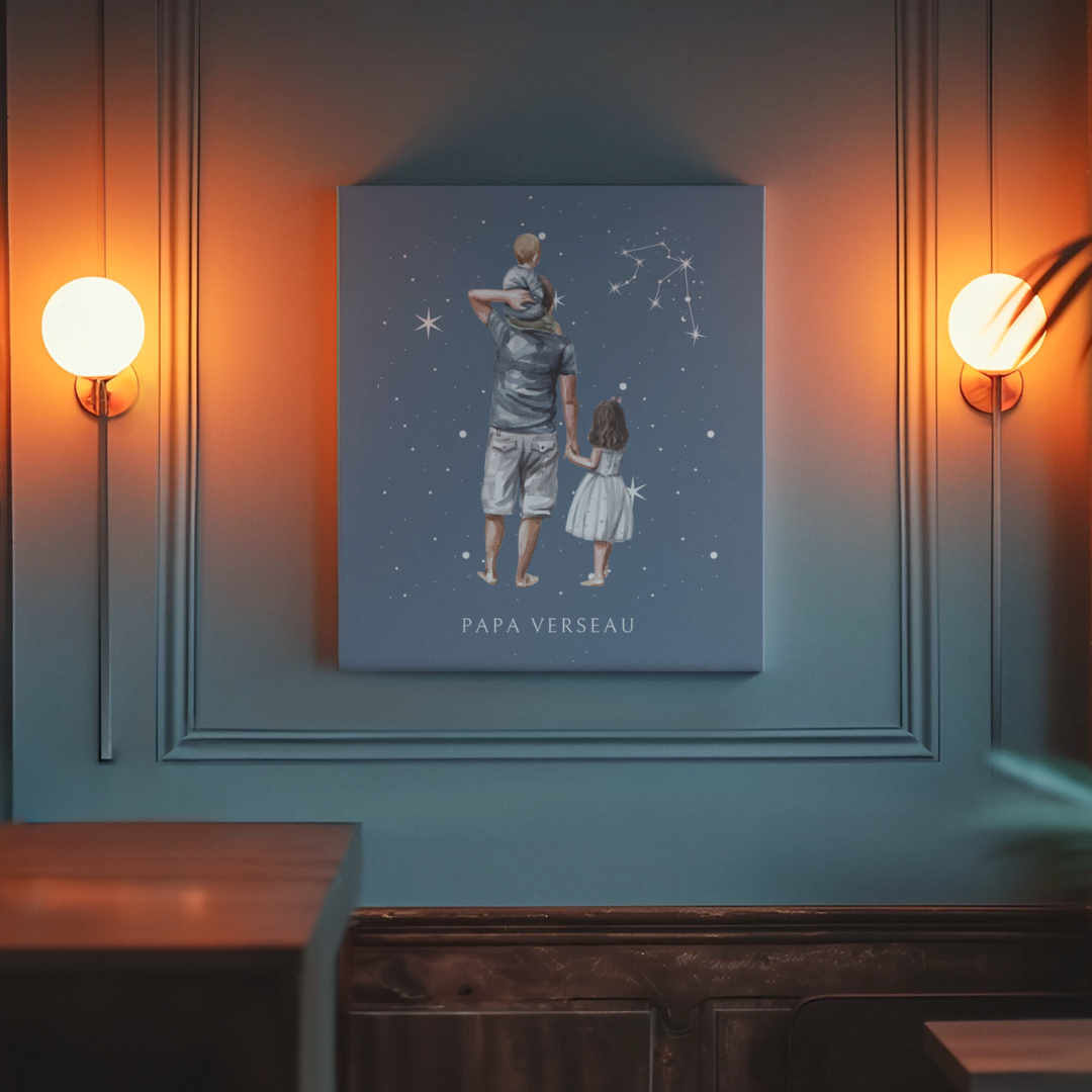 • Design exclusif : Une illustration inspirante qui représente la connexion entre un père Verseau et son enfant sous l'éclat de la constellation, symbole de liberté et de bienveillance.