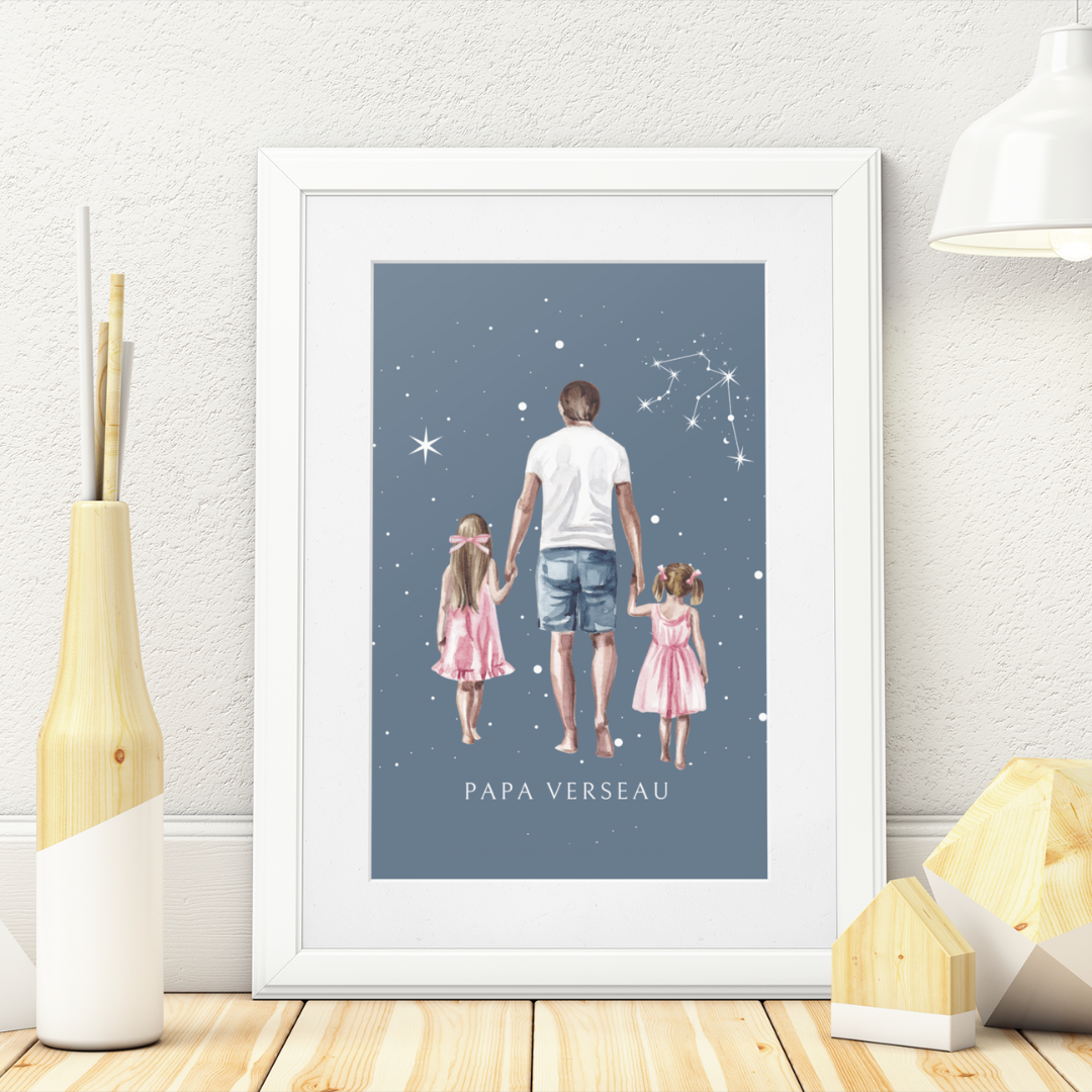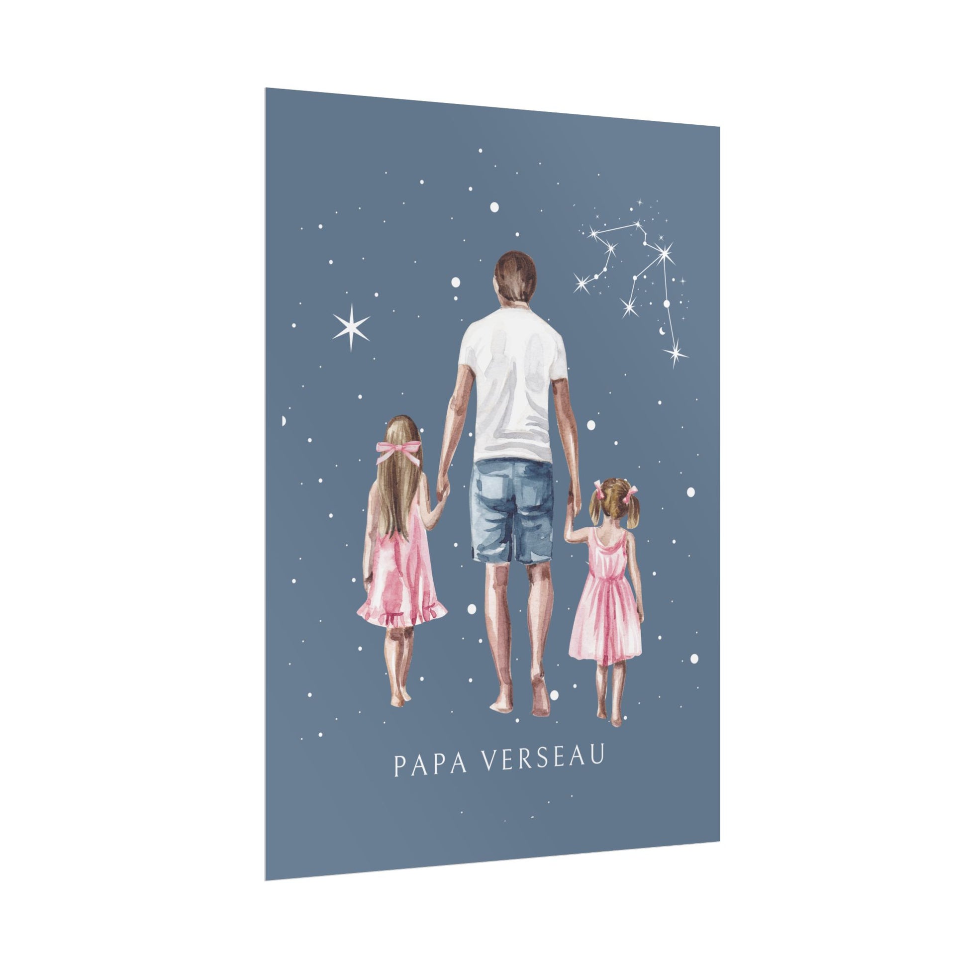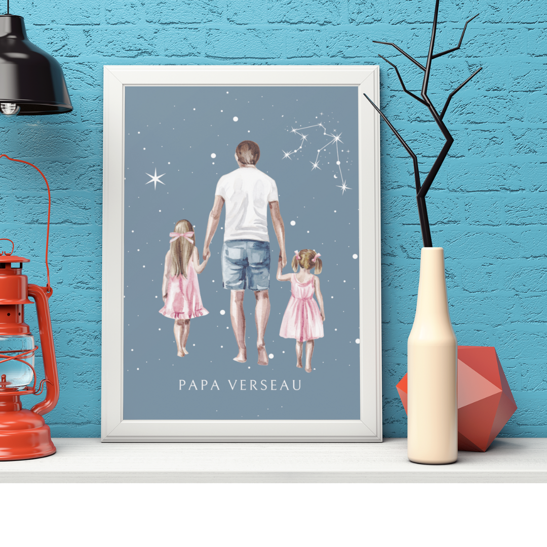 Apportez une touche d’originalité et de bienveillance à votre intérieur avec ce poster de la collection Cosmic Dad. L’illustration montre un père tenant tendrement ses filles par la main, le tout baigné dans la lumière douce de la constellation du Verseau. Ce design représente la paternité unique d'un papa Verseau, plein d’amour et de vision.
