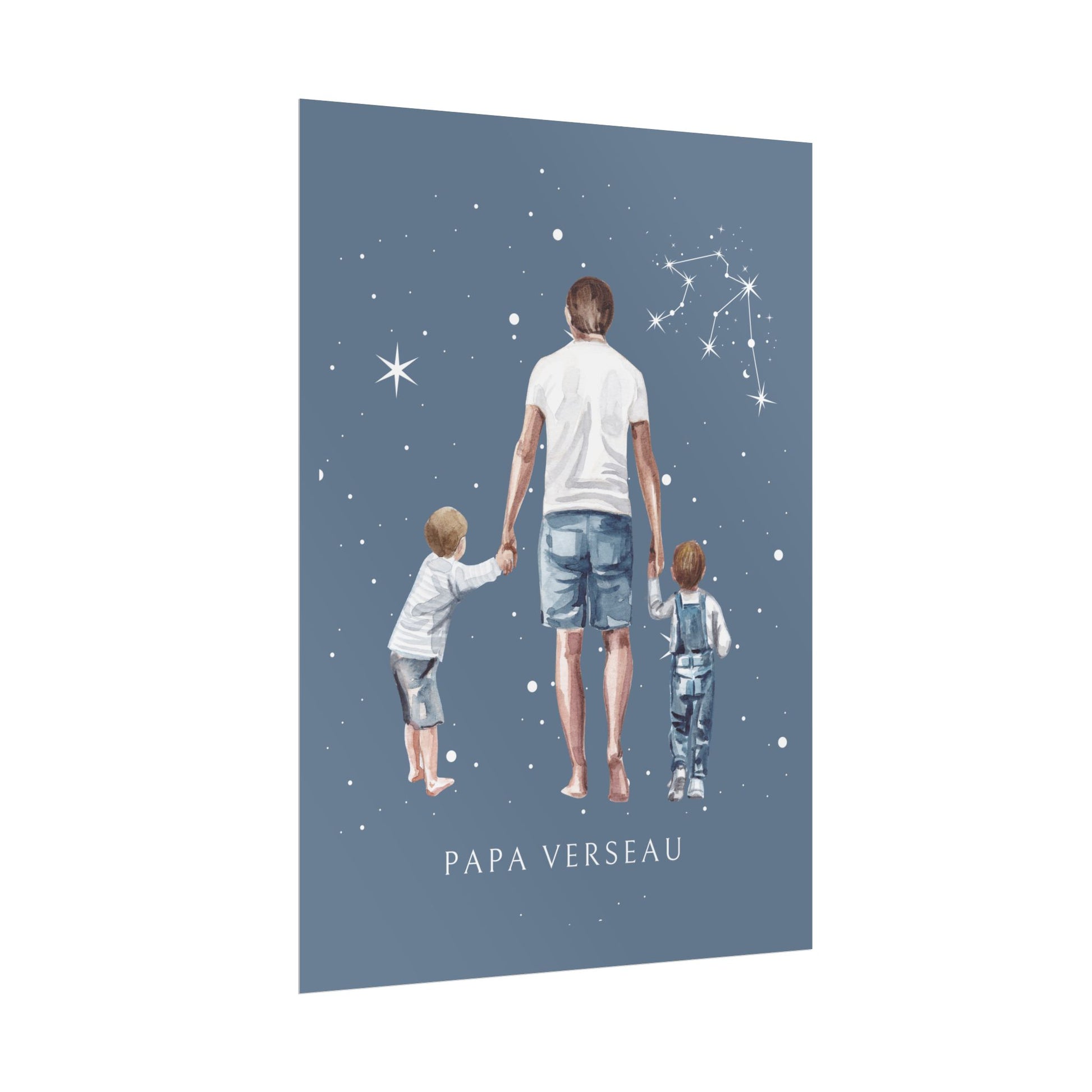Apportez une touche d’originalité et de bienveillance à votre intérieur avec ce poster de la collection Cosmic Dad. L’illustration montre un père tenant tendrement ses fils par la main, le tout baigné dans la lumière douce de la constellation du Verseau. Ce design représente la paternité unique d'un papa Verseau, plein d’amour et de vision.